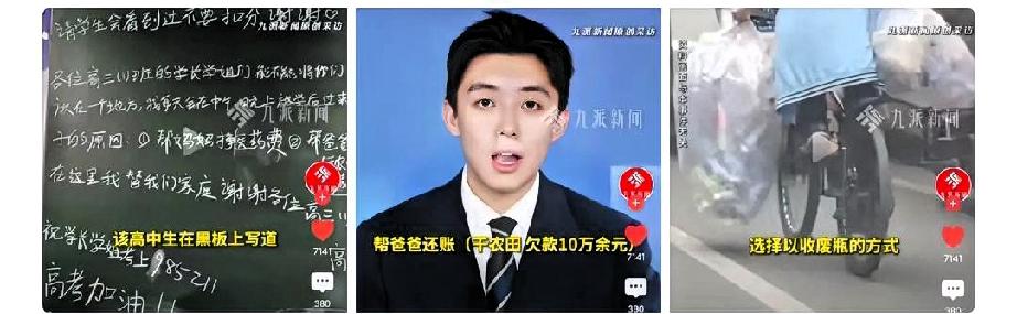 苦难才是人生的第一导师。 淮南某高二学生在黑板上写道:请高三的学长学姐们,能不能把你们喝过的饮料瓶堆放在一处,我中午或者晚上放学过来取。原因,一帮妈妈挣医药费,二帮爸爸还账。替我们家庭谢谢你们!祝学长学姐都考985。 留言在黑板上的高二学生,说他想对高三的学长学姐说一句话,他说“希望学长学姐喝完的饮料瓶可以留着给我,一帮妈妈挣医药费,二帮爸爸还账。 ”他说这句话的时候,眼里透着坚定与不服输。 他没有因为家庭的困难而怨天尤人,也没有因为家庭的困难而放弃自己的学业。他把家里遇到的困难当成了给自己加油打气的动力。 用阳光的心态,坚韧不拔的斗志,朝着自己的目标奋发向上。 人的一生会遇到许多挫折,许多坎坷,但人生的挫折和你做出的选择,会决定你今后走的路。 年轻的时候就应该勇敢地做出选择,坚定地走下去,不怕困难,不怕挫折,不怕别人的嘲笑和指指点点。 麻烦看官老爷们右上角点击一下“关注”,既方便您进行讨论和分享,又能给您带来不一样的参与感,感谢您的支持!