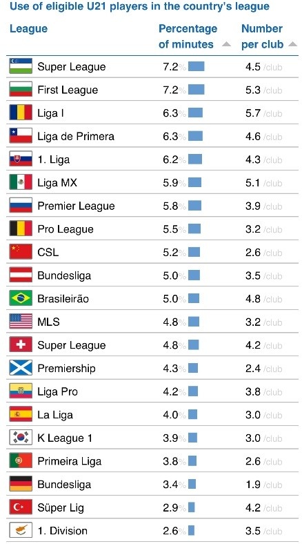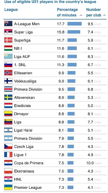 U21球员出场时间占比17.7%的澳超联赛,在本次排名中位居首位。塞尔维亚超级联赛(15.8%)和丹麦超级联赛(11.7%)紧随其后,排名二三位。