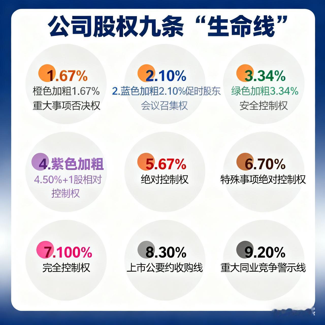 一图搞懂!公司股权9条“生命线”,创业/持股/打工必看,少踩90%的坑! 1. 67%「绝对控制线」:持股超2/3,公司合并、修改章程等“终极大事”可直接拍板,手握绝对话事权,无人能撼动; 2. 51%「相对控制线」:持股过半就能决定高管任免、敲定年度经营目标,日常核心决策全由你说了算; 3. 34%「一票否决线」:手握1/3股权,公司重大事项只要你不同意,直接“一票喊停”,守住关键决策权; 4. 30%「要约收购线」:上市公司股东持股超30%,若想继续增持,必须公开要约收购,严禁“偷偷加仓”; 5. 20%「竞争警示线」:若股东持股超20%且涉足同行业,需警惕其搅局经营、争夺控制权; 6. 10%「临时会议线」:持股满10%,可自行召集股东会,甚至向法院申请解散公司(需依法审批); 7. 5%「变动警示线」:上市公司股东持股超5%,后续增减持需公开披露,全程透明无暗箱操作; 8. 3%「临时提案线」:持股3%即可在股东会召开前10天提交提案,让你的想法进入集体议事议程; 9. 1%「代位诉讼线」:哪怕仅持1%股权,发现高管违法损害公司利益,可代表公司提起诉讼维权!