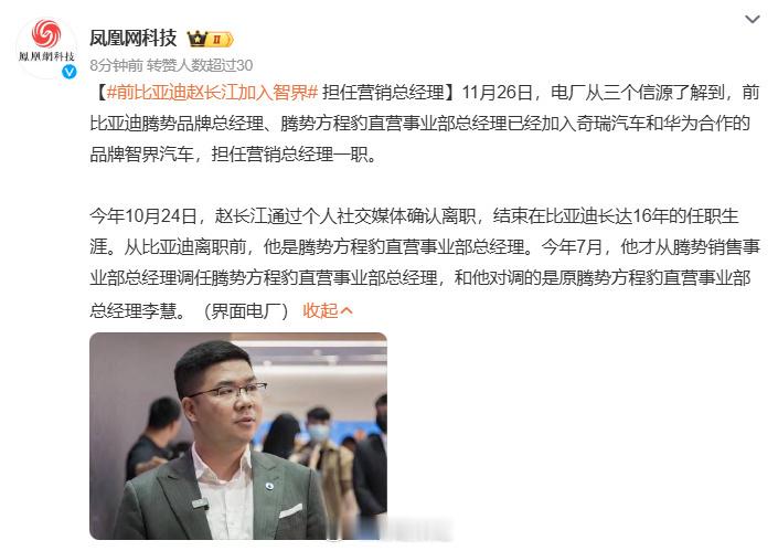 前比亚迪赵长江加入智界 鸿蒙智行首款MPV就落在智界,让负责过腾势D9的赵长江来做智界营销总经理,可太合适了。就是不知道让自己的两个孩子竞争,心情怎么样
