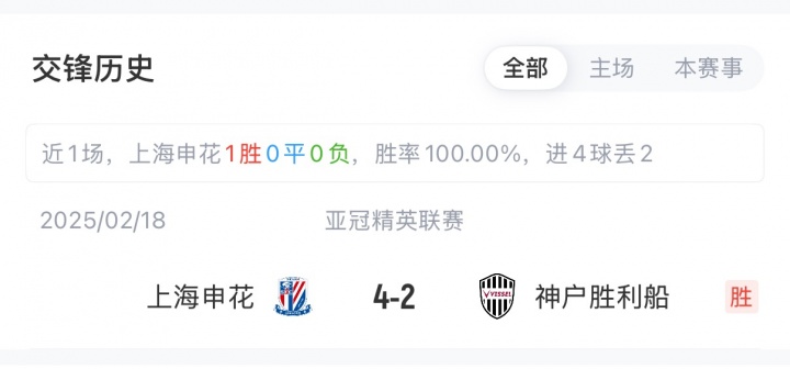 亚冠前四轮,申花1胜1平2负积4分排在倒数第二,神户则是3胜1负积9分;今年2月两队曾有过一次交锋,申花在主场4-2战胜神户胜利船。