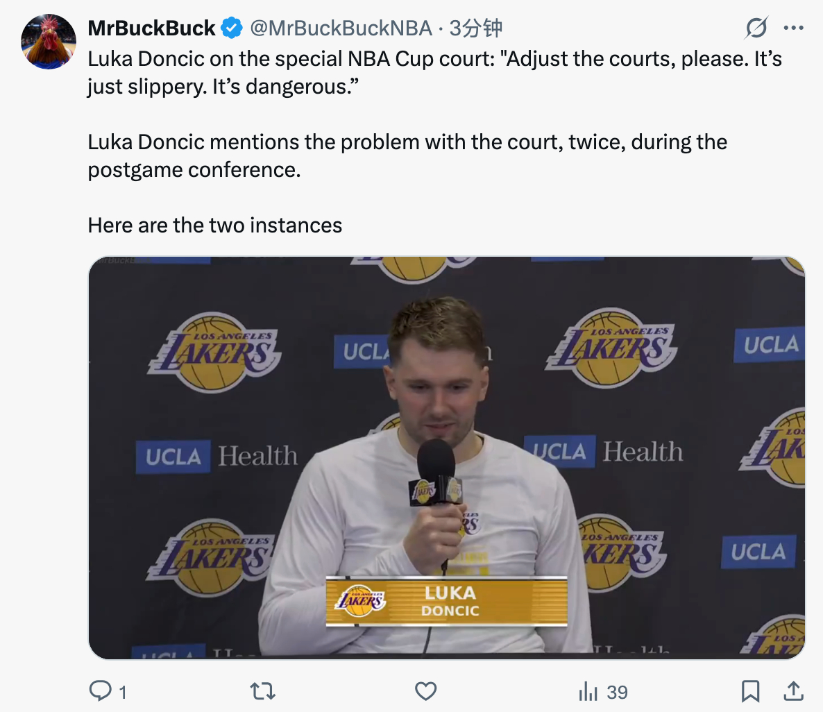 卢卡·东契奇赛后谈到特殊的 NBA杯的特别球场时说:“请调整这些球场吧。它们太滑了。这很危险。”作为球迷,我想说,调整一下配色吧,眼睛都没了,那个颜色简直受罪