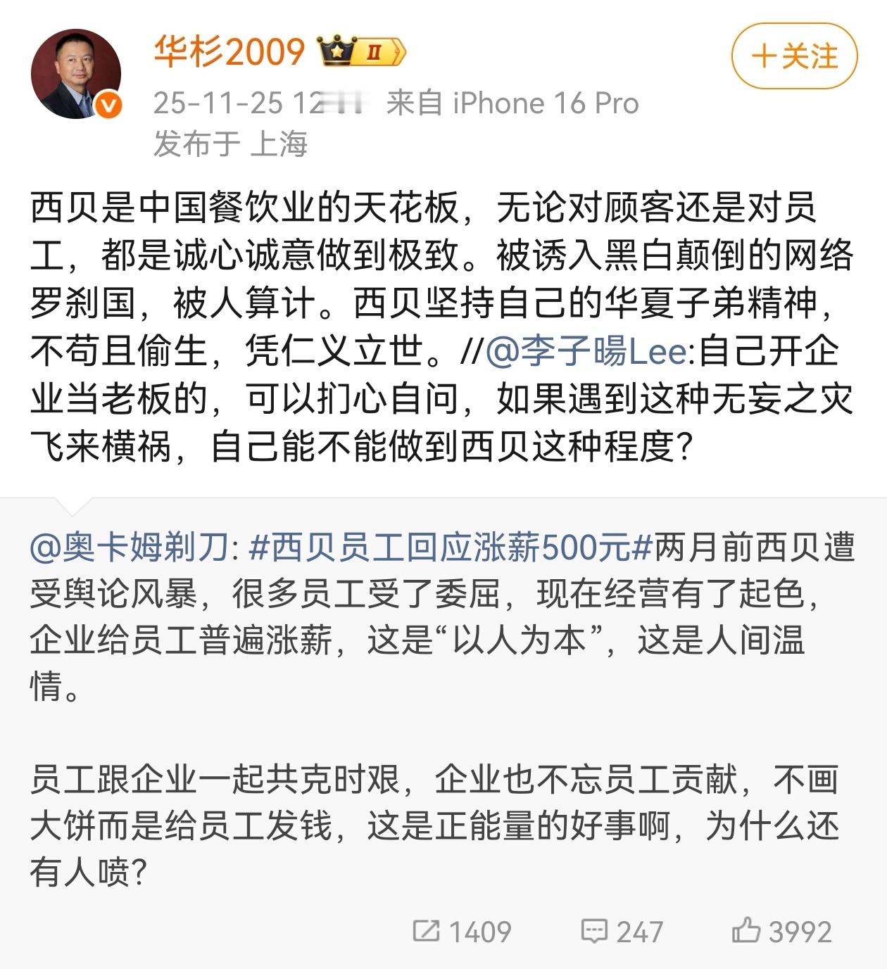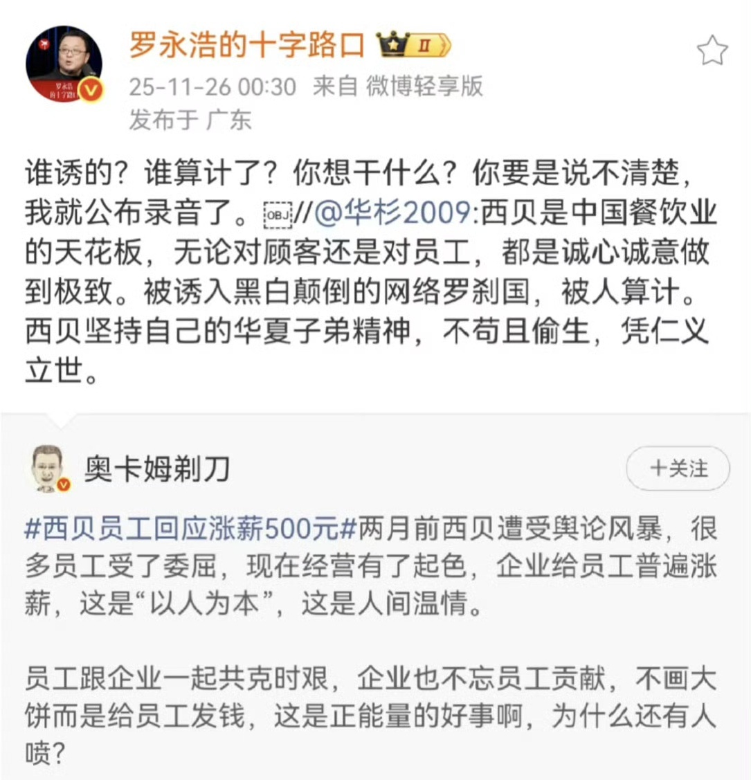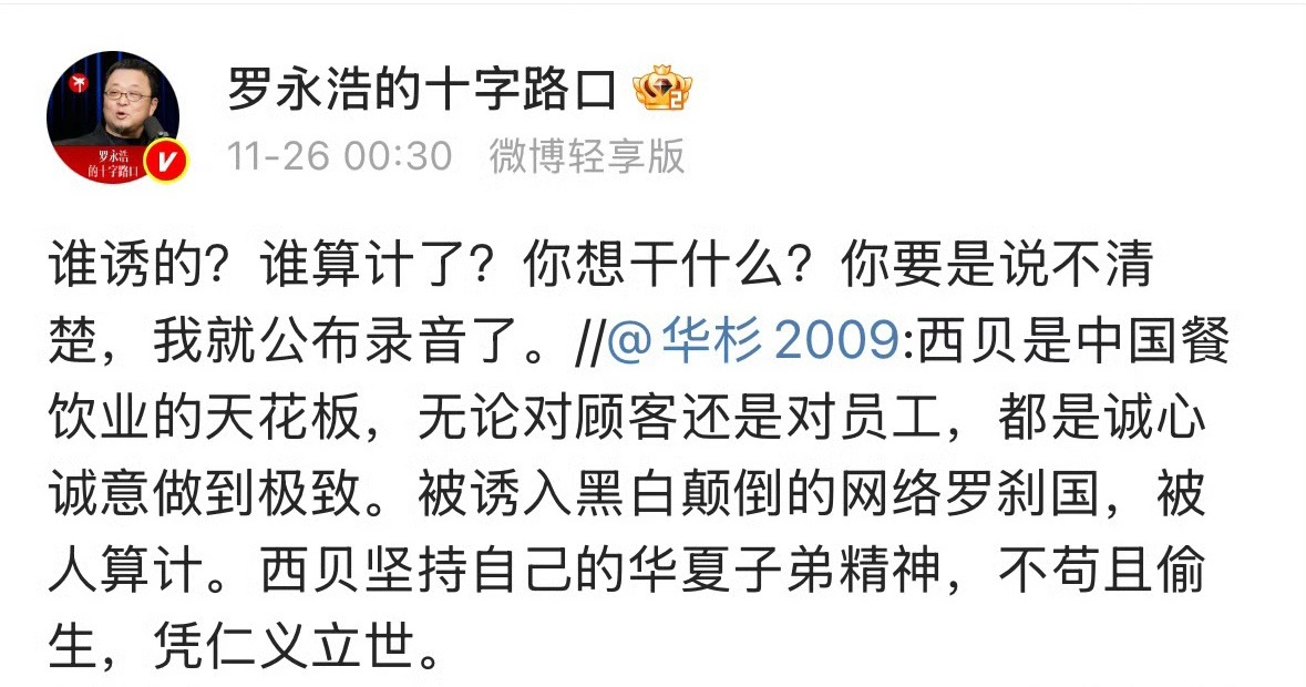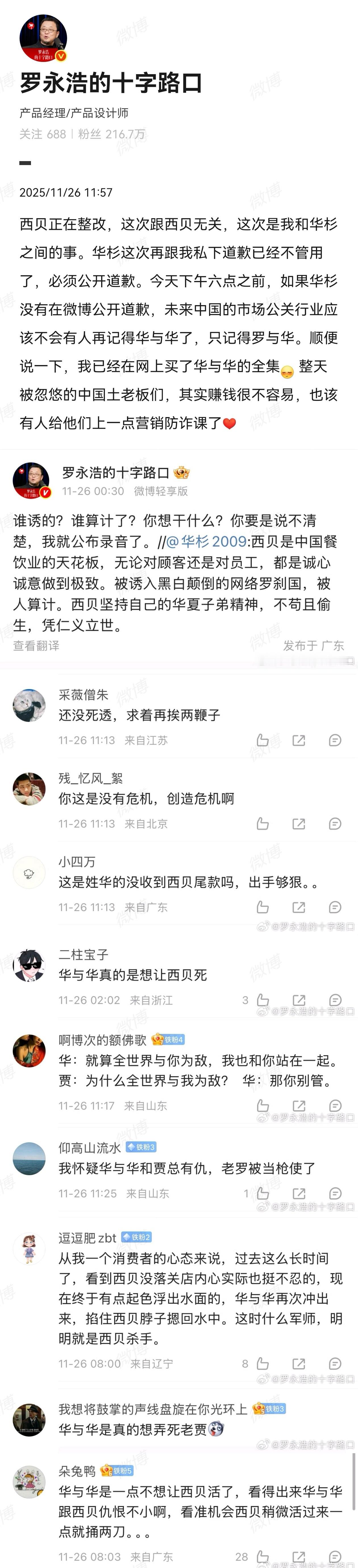 11月25日,华与华创始人发文称“西贝被人算计”,引发怒怼,并称华杉不道歉将会公布录音,个人猜测罗永浩录音内容,应该是华与华兄弟当时的“求和”引起。西贝事件已翻篇,至于罗永浩、华杉间的矛盾,个人还是录音能公开,既然老罗提了,不让网友听听,反而不是老罗的做事风格。罗永浩怒怼华与华创始人华与华创始人称西贝被算计经此一役,江湖就让不再有“华与华”,再好的“超级符号”“超级创意”,也经不起华杉这么折腾,明明在舆论场上输得很彻底,还不端正态度,完全可以大路朝天、各走各的,却还想着在网上装一把,找回下丢掉的颜面。诚然,华与华擅长所谓的“战略营销”,但危机公关才是检验一家营销团队的关键,华与华给西贝帮的都是“倒忙”,老罗这次只针对华杉,当争执双方都是个人,那就看谁手里的“底牌”更多了,如果华杉不道歉、不认怂,大概率会再次败北。罗永浩 华杉