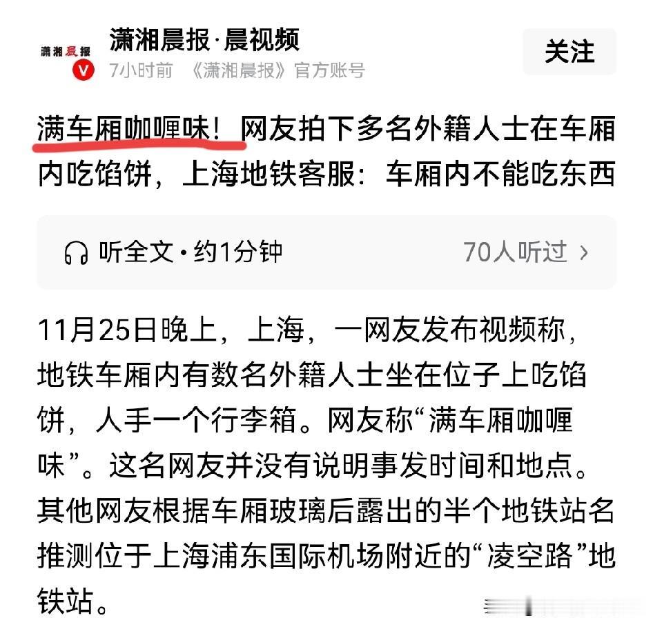 外国人在地铁上吃馅饼,弄的满车都是厢咖喱味,我们还是高估了部分外籍人士的底限…[捂脸] 地铁既然让这些印度人带食物过了安检就证明地铁没有禁止乘客携带食品,这也和地铁的回应相符,地铁只是不允许在车厢里吃东西,国内乘客相互之间也有这种默契。 但这些外籍人士是例外,因只顾自己吃着舒服就行… 有人说,车厢里的其他乘客看到印度人吃气味大的食物应该提醒,这种行为是不当的。可这就像半夜在居民区放高音喇叭,虽然可能没有明确标识,但这是常识呀,如果连这种基本的常识都需要人提醒,那这水准可真够差的。 朋友们,你们对此事怎么看? 欢迎大家在评论区探讨,留言…[送心]