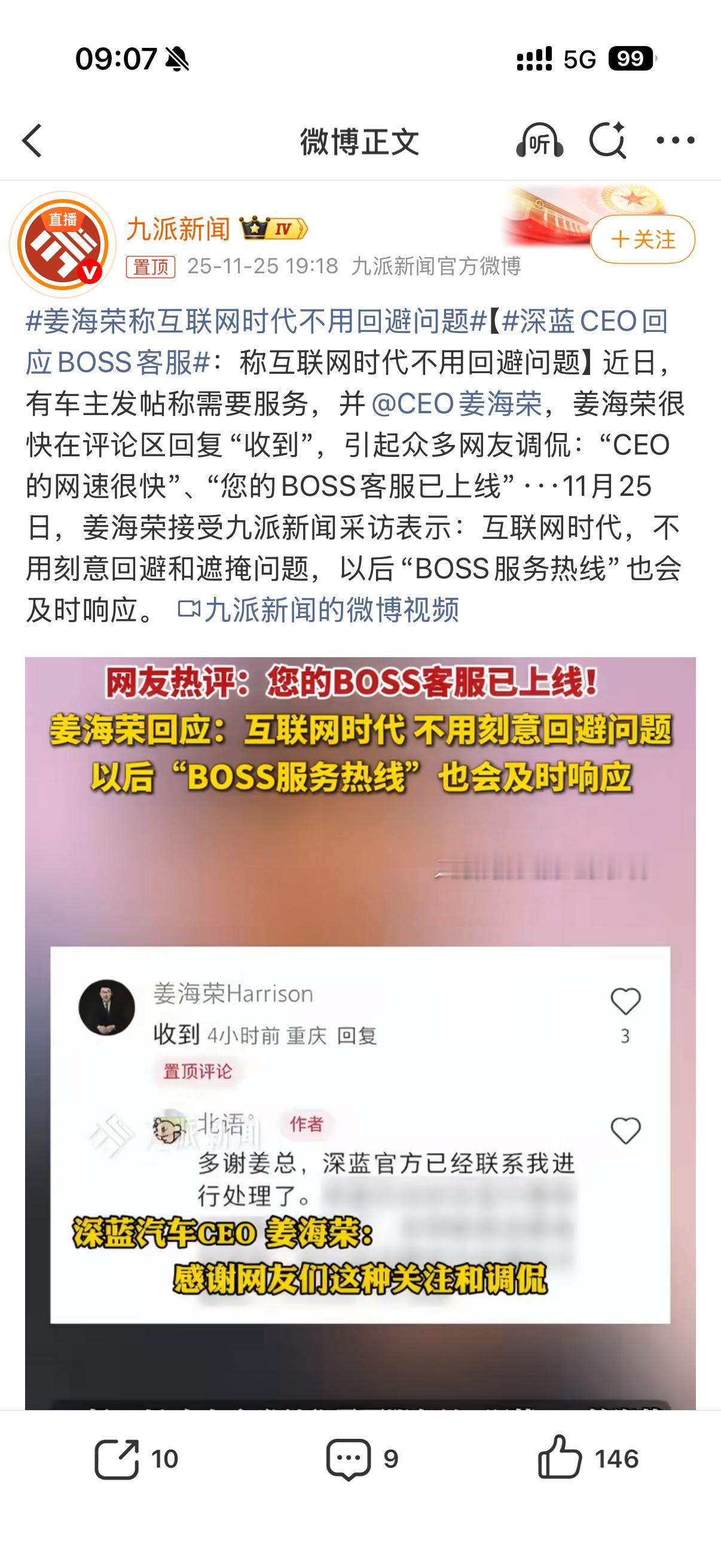 别人是BOSS直聘找工作,深蓝直接整了个“BOSS服务”宠车主!事因是最近有深蓝车主有服务需求,直接发帖,没想到CEO秒回“收到”,网友直接惊到,全夸网速拉满,姜总还说:“现在互联网时代不用躲着问题,踏踏实实解决车主事儿才管用”,以后这BOSS服务也会随叫随到,车主们有事儿真能找着人撑腰啦深蓝CEO回应BOSS客服