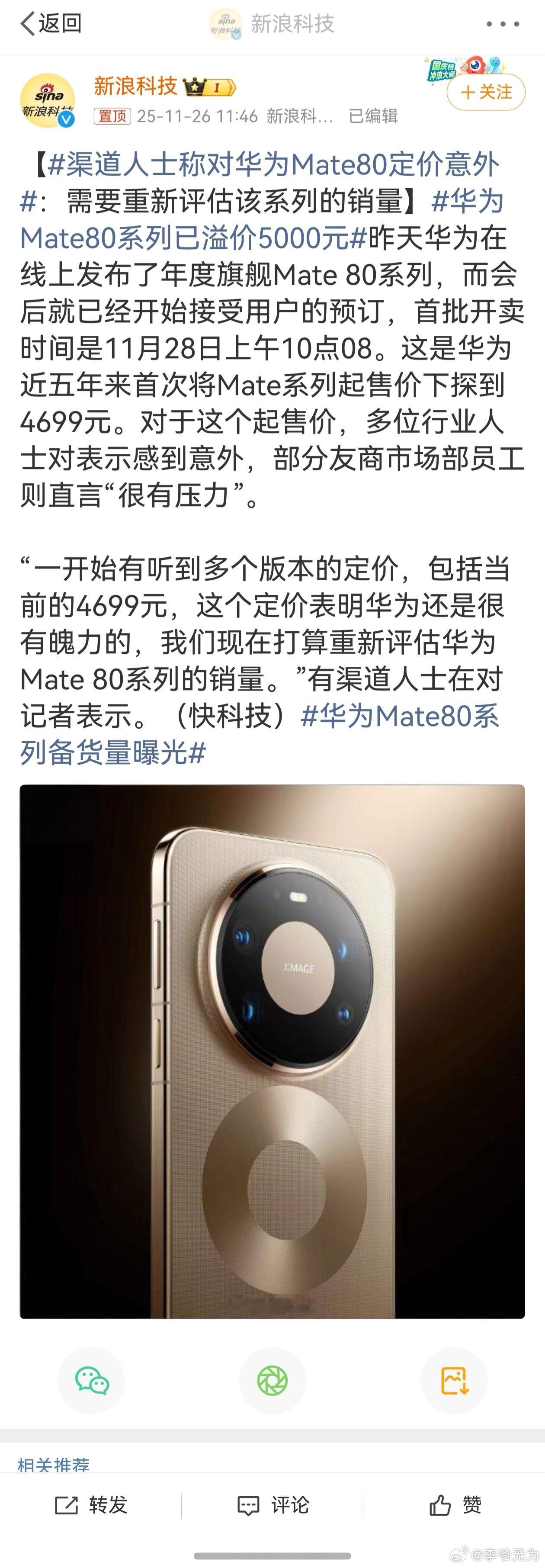 【渠道人士称对华为Mate80定价意外 :需要重新评估该系列的销量】华为Mate80系列已溢价5000元 😂华为不降价,你们阴阳怪气说华为割韭菜,没有性价比,自研猪肉又贵又难吃。华为一降价,慌了吧。是不是又该说华为不讲武德不按套路出牌