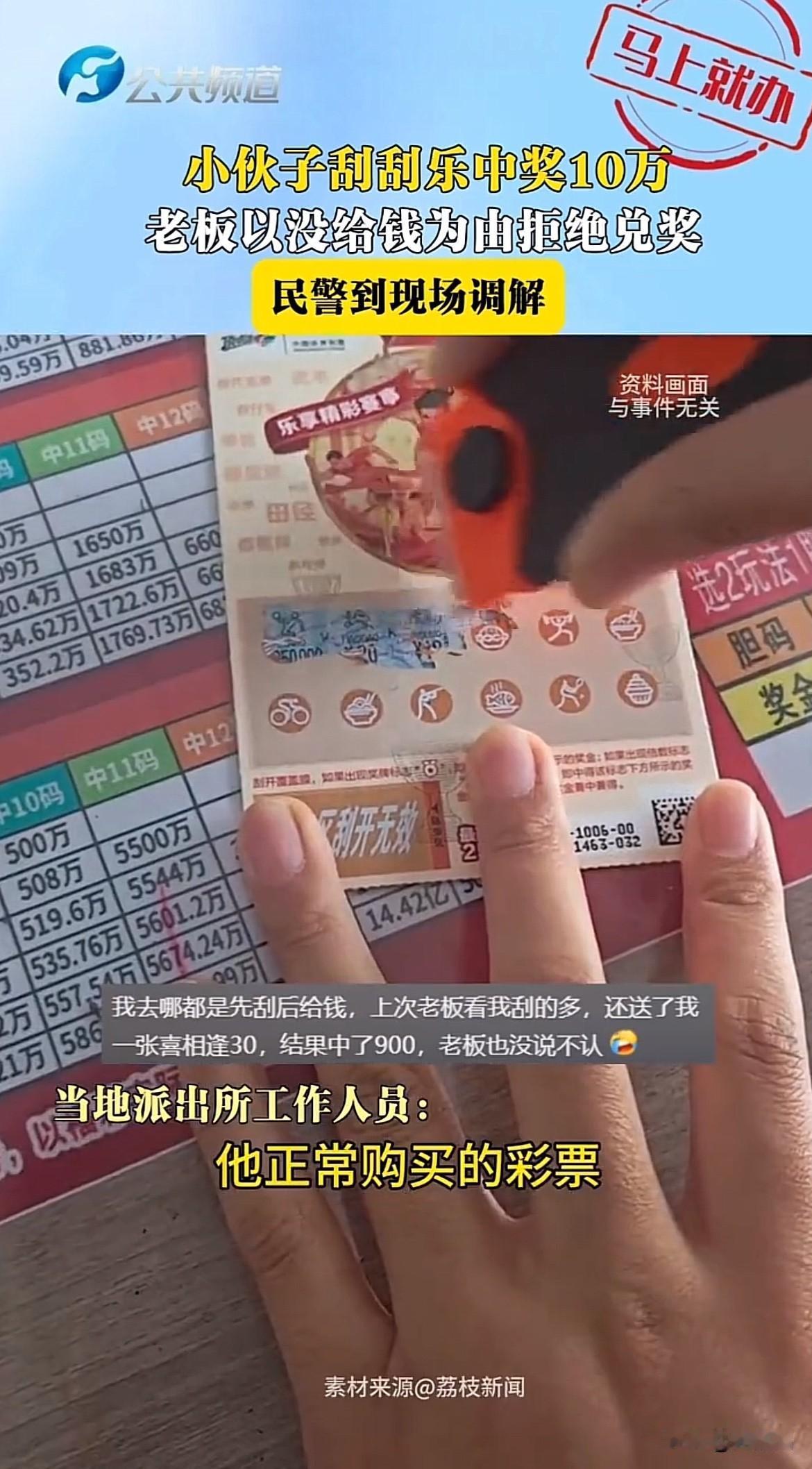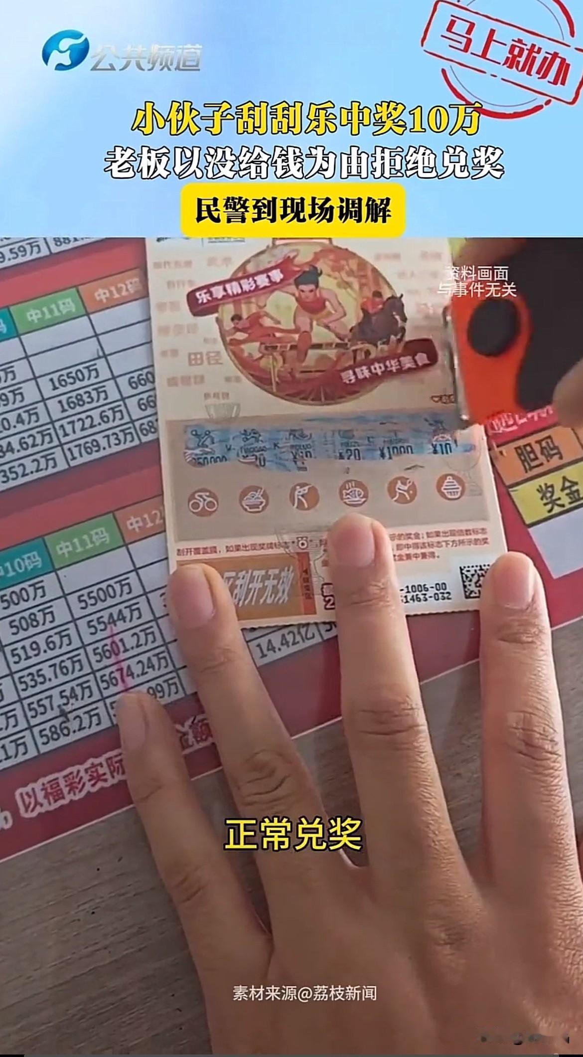 见钱眼开,老板不认账!小伙子运气爆棚刮刮乐中奖10万,结果老板以没给钱为由拒绝兑奖。 浙江金华一位年轻小伙,平时喜欢玩刮刮乐,都是这家彩票店的熟客。这天也和往常一样,先刮奖后付款,和往常不一样的是,这次中了大奖,足足有10万,高兴地立马找老板兑奖。 老板一看,还真是中了10万,打起了歪主意,以没提前给钱以由拒绝兑奖,明眼人都看出老板是想占为己有啊。无奈之下,只能找来民警调解。 民警:你不同意,他怎么拿到呢? 老板:跟你说过了,他一天到晚自己拿,都是自己伸手到台里拿的。 最终民警表示正常购买的彩票,正常兑奖。这下老板双输了,钱没到手,反把诚信丢了,以后谁还敢在你这买啊?搞不好又来一招不认账,任谁都闹心。 男子刮刮乐中奖10万 老板拒绝兑奖晒图笔记大赛