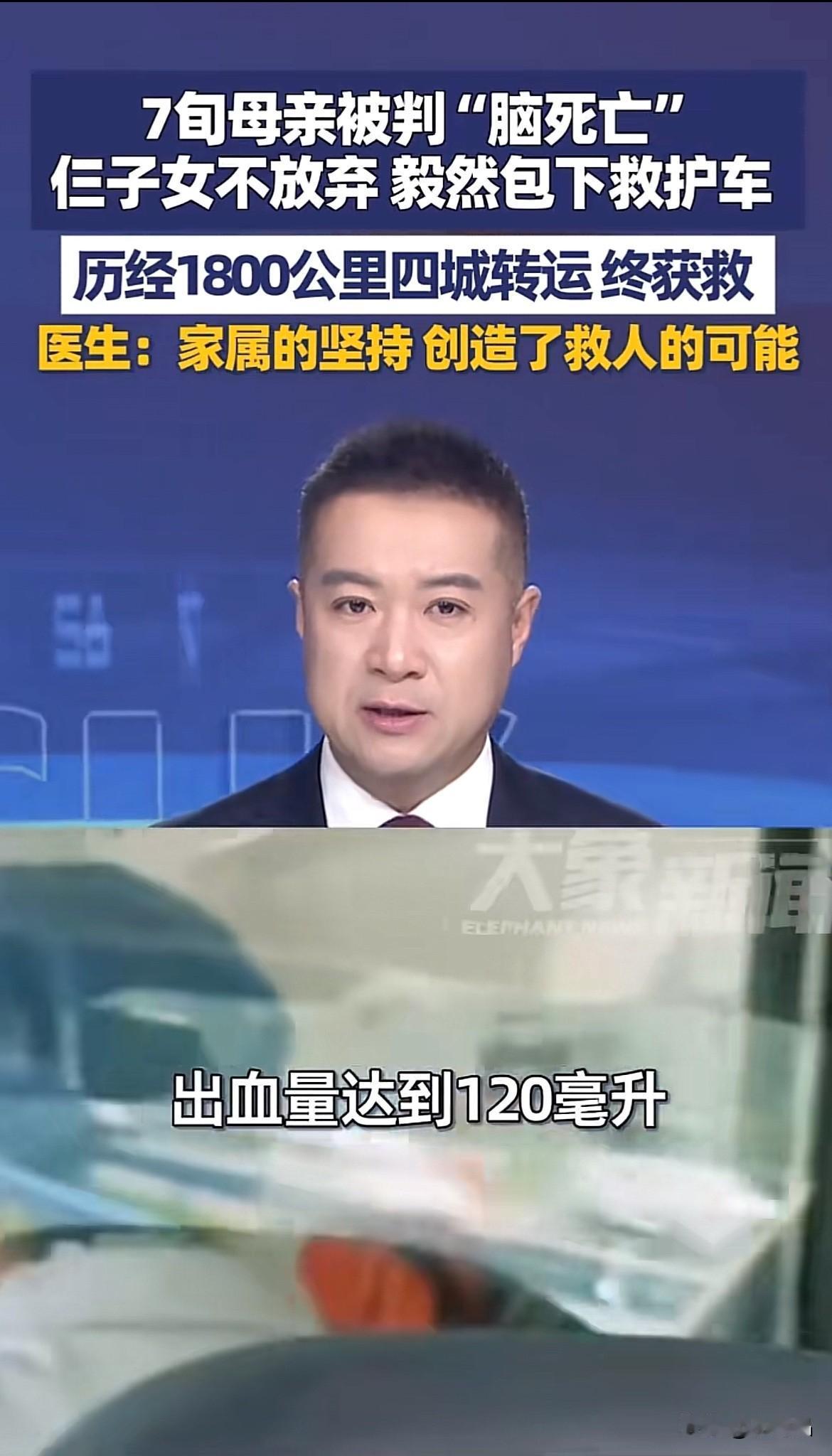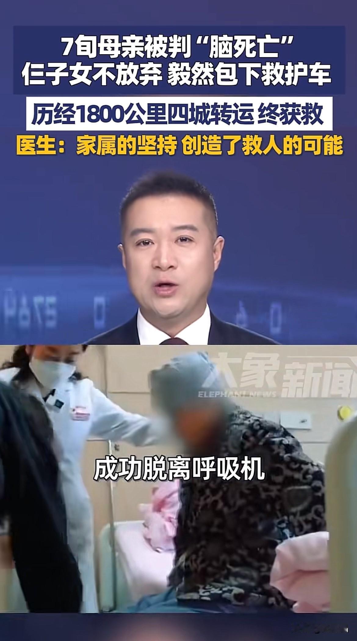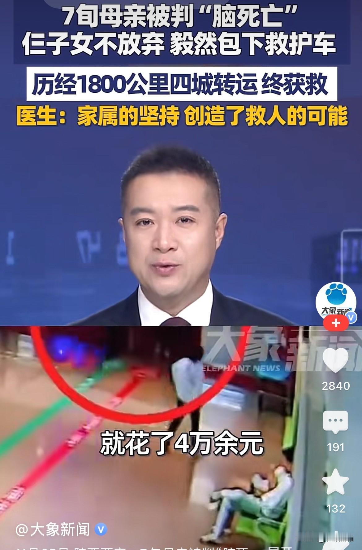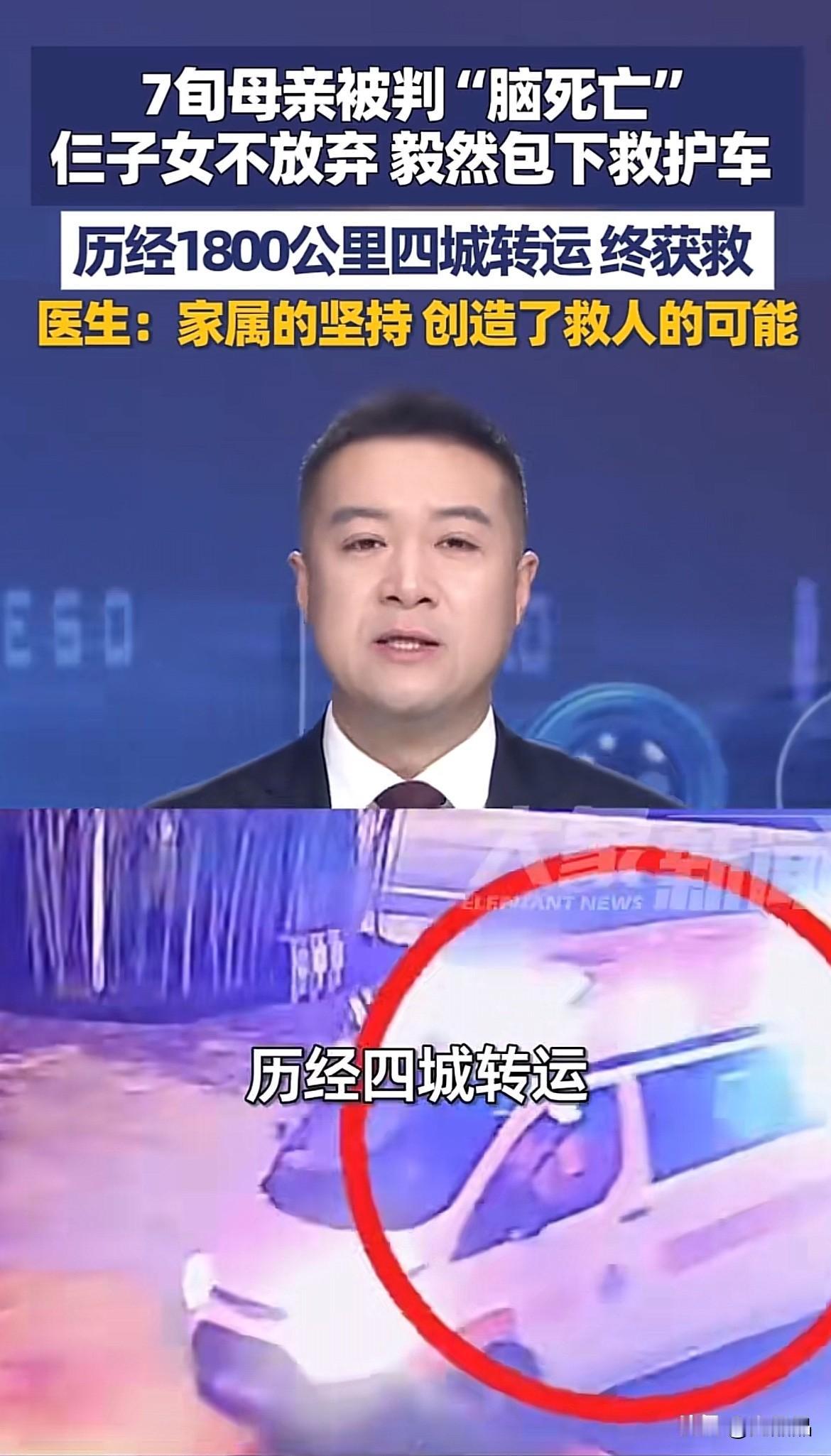 孝心创造奇迹!75岁母亲突发脑出血被判脑死亡,3个子女不放弃,转运四城求生机。 甘肃一位七旬老人tufā颅内肿瘤破裂,出血量达120毫升,当地医院束手无策,宣判脑死亡。 三位子女不想就此放弃,包下一辆救护车,转运四座城市,辗转1800公里,光车费就花了4万多,送到医院时,老人情况依然危急,医生称救治机会渺茫。 女儿说:“我不想再这样拉母亲回去,求你们再试试。” 所幸经过医生的努力救治,老人已脱离危险,恢复自主意识,摆脱呼吸机可自主呼吸。医生都赞扬道:“是你们的坚持,创造了救人的可能”。 有人说孝心感动天地,子女的孝顺给了母亲重生。也有人说,经济条件救了老人,要是子女没钱,恐怕老人就没救了。 是啊,孝心是基础,经济条件是助力,老人得救是多子女的孝心、经济能力和医生等综合因素的结果。父母总会有老去的一天,当子女的努力赚钱,也是为了这一刻能多争取一下,给老人重生的机会,子女也能问心无愧。 图源:大象新闻 带定位晒今日生活母亲被判脑死亡 子女不放弃终获救