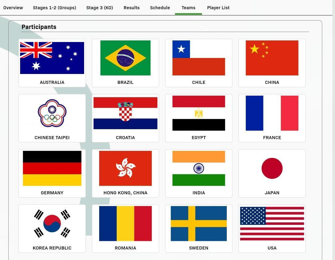 成都混团世界杯30号开打。 16支队伍见图。 比赛采用15局8胜制,即混双、男女单、男女双各打3局,先胜8局者获胜。 16个队先分4个小组进行循环赛,小组前两名出线。 然后8个队再打一次循环,小组赛已经碰过的不再交锋。 成绩靠前的4队再进行半决赛和决赛。