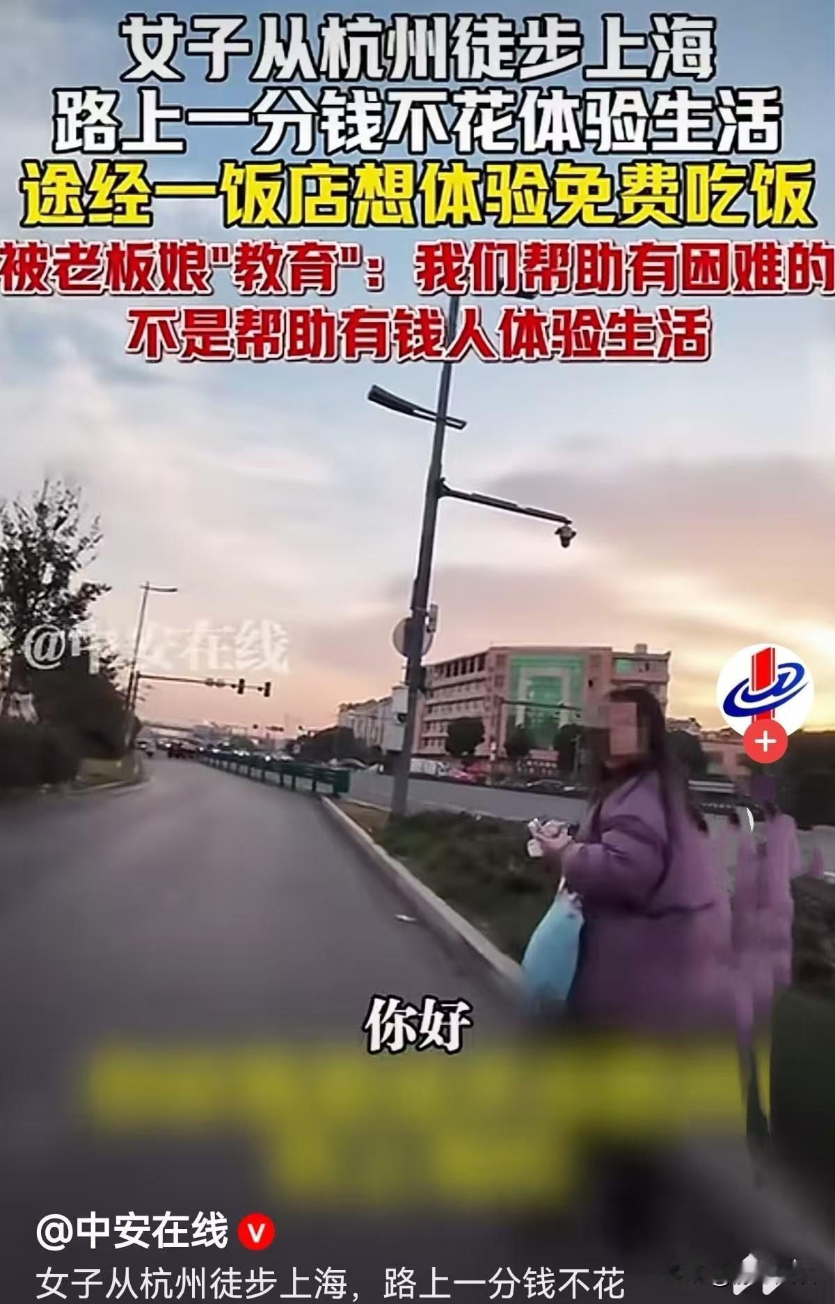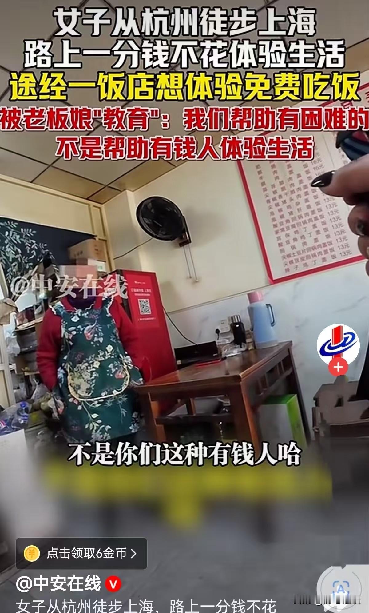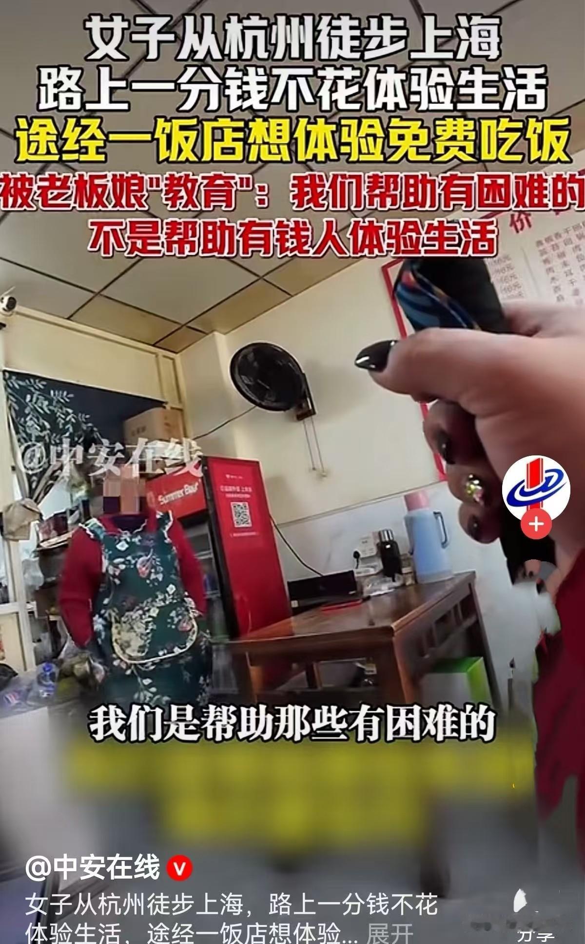 杭州,女子为体验徒步从杭州到上海不花一分钱,让陌生人提供她吃住和开销。途中向一女孩寻求帮助被拒,而后她走到一小餐馆,向老板娘说明情况,想体验免费就餐。老板娘当场让她下不来台:我们只帮助有困难的人,要饭的穷人,不是帮助有钱人体验生活!网友:说的好,善良留给真正需要的人! 最近有个女子的徒步视频在网上火了,不是因为她毅力惊人,而是因为路上求免费帮忙的事儿,被饭店老板娘当众“教育”了一顿,网友看完纷纷叫好。 这女子体验生活,决定从杭州徒步到上海一分钱都不花,女子根本不缺钱,就想感受穷游不花钱的滋味,全程吃喝住行全靠陌生人帮忙。 出发前她还美滋滋地想着,世上还是好人多,肯定有人愿意为她的“体验”买单。 果不其然,徒步路上还真遇到不少心软的好心人,看她背着行囊徒步辛苦,主动请她吃了几顿饭。 几次顺利的经历,让她心里越发笃定,自己的这个“体验计划”没问题,一定会顺利完成此行程。 可在路上,现实很快就给了她一记闷棍。 这日中午,女子一看该到吃饭时间了。 于是,她拦住了一位在街上行走的年轻姑娘,脸上堆着笑凑上去搭话:小美女你好,我正从杭州徒步去上海呢,这一路上所有的吃住问题都得自己解决,你能帮我个忙吗? 她原以为对方会多少给点帮助,没料到姑娘想都没想,干脆利落地甩了两个字:不能。被拒绝的女子愣了一下,只好讪讪地走开了。 肚子饿得咕咕叫,女子没辙,又盯上了路边一家小饭店。 她走进店里,便满脸堆笑地跟老板娘说明了来意,特意强调自己是“体验生活”,不是缺钱,想让老板娘免费给她做顿饭。 没等她说完,老板娘就皱起了眉头,语气直截了当:你们这些有钱人,还特意来体验生活,一顿饭钱都舍不得给? 女子赶紧解释:大姐,不是我舍不得花钱,是我给自己定了规矩,不让花钱,这就是一堂体验课。 可老板娘根本不买账,语气更实在了:我们开店做生意,平时遇到真有困难、要饭的,吃不上饭的人,肯定会帮一把。但我们帮的是穷苦人,不是你们这种来体验生活的有钱人。 老板娘接着说:你们有钱人体验生活,我们不反对,可我们小本生意赚辛苦钱,只帮也只帮需要帮助的穷人! 老板娘的话掷地有声,店里的食客都纷纷看了过来。女子的脸一下子涨得通红,从耳根热到了脖子,手都不知道往哪儿放。 她满心都是委屈和愤怒,觉得自己只是想体验生活,又没做错什么,老板娘怎么这么不通情理,一点爱心都没有? 她没再争辩,有些尴尬地摆摆手说:没事、没事大姐!便转身就快步走出了饭店。 身后还隐约传来食客们议论的声音,让她恨不得找个地缝钻进去。 憋着一肚子气的女子,回去就把这段经历剪成视频发了上网,本想让网友们帮她评评理,吐槽一下老板娘的“不近人情”。 可评论区的风向,却彻底让她傻了眼。 网友们清一色站在老板娘这边,评论区全是“骂得好”“干得漂亮”。 有人说:老板娘三观太正了!她的话,狠狠地给白嫖的人一记响亮的耳光,体验生活是免费帮助别人,不是让别人免费帮助你。 善良不是这么被消耗的,真正的困难值得帮,这种吃饱了撑的体验,谁爱管谁管! 有人说,如果有钱人去体验扫大街,刷厕所,照顾孤寡老人,那我们很赞成,去体验免费吃饭,那真看不起,那不等于吃霸王餐吗? 真是厚颜无耻,美其名曰体验生活,实则就是想白嫖! 大家的吐槽一针见血:老板娘起早贪黑守着小饭店,每一分钱都挣得不容易;而女子拿着钱不花,专门蹭吃蹭喝,消耗的是陌生人的善意,会让真正需要帮助的人,未来求助时更难。 要是她真想体验生活,完全可以在店里洗碗端盘子,用劳动换顿饭吃,可她偏偏选择手心朝上白嫖。 这场所谓的“体验生活”,说到底不过是自私自利的借口。这个社会的善意从来都不是廉价的,它应该留给那些真正走投无路、急需帮助的人,而不是被这些闲得无聊的人拿来消遣和践踏。 《民法典》第5条规定:民事主体从事民事活动,应当遵循自愿原则,按照自己的意思设立、变更、终止民事法律关系。 饭店经营核心是通过售卖餐饮换取对价,向他人提供免费食物仅属于基于慈善或同情的自愿行为,并非法定义务。 该女子既非生活无着的困难群体,也与饭店无任何需免费供餐的约定,饭店完全可按自身意愿拒绝,这是对自身民事权利的合法行使。 《民法典》第657条规定,赠与合同是赠与人将自己的财产无偿给予受赠人,受赠人表示接受赠与的合同。 老板娘若主动免费给女子饭菜,本质是将餐饮服务这一财产性利益无偿给予对方,女子接受即达成赠与合同。 这种行为前提是老板娘自愿,而老板娘声明,她愿意帮助那些有困难的要饭的,不是你们这种有钱人啊! 其实啊,徒步旅行本身是件挺好的事儿,但打着“体验生活”的旗号,把自己的需求强加给陌生人,消耗别人的善意,就有点说不过去了。 毕竟,每个人的善良都很珍贵,该用在真正需要帮助的人身上。 对此您怎么看?