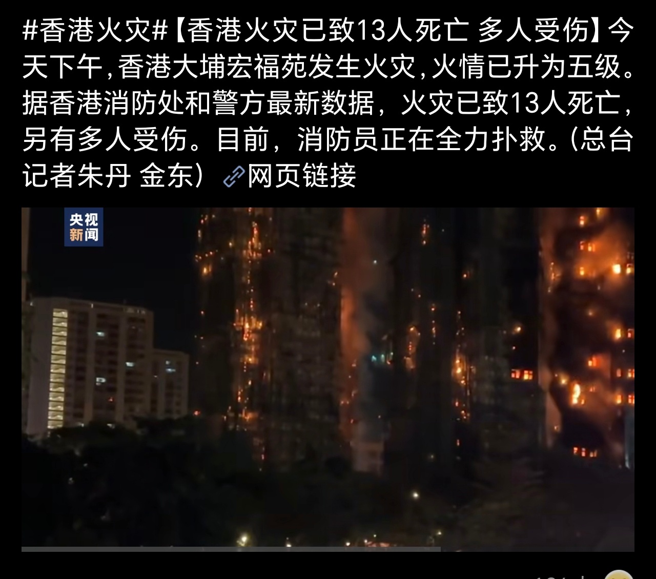 刚有点时间刷手机,就看到香港火灾,什么情况啊?伤亡有点大啊,希望这个人数别再加了……