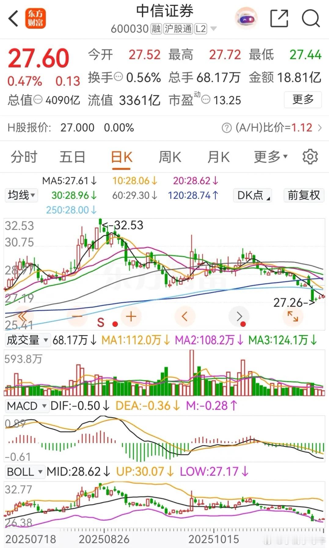 东方财富连续三天在低位缩量整理,且被主力资金连续九天净卖出;而中信证券,则是连续三天在底部收出缩量小阳星,连续三天小反弹。东方财富今天平开后冲高回落,午后持续走低,最终收出了一根缩量十字星线,股价下跌了约0.34%,报价23.34元,全天的成交金额为 39.54 亿元,已是缩量到了极致。在资金流向上,目前是连续九天被主力资金净卖出,今天的净卖额约为1.4676亿元,近五个交易日则是合计净卖出了约18.4401亿元,而近20个交易则是仅有3天净买入,其余17均是净卖出,合计净卖出金额为94.500亿元。中信证券目前是连续三天在低位收出缩量小阳星,今天的涨幅为 0.47%,收盘报价为27.60元,全天成交金额为18.81亿元。在资金流向上,目前已是连续五天被主力资金净卖出,今天被主力资金净卖出了0.3930亿元,近五个交易日则是合计净卖出了 11.5128亿元,近20个交易日则是合计净卖出了55.1829亿元。从技术面上看,东方财富是连续三天在低位横盘缩量整理,连续三天收出缩量十字星线,而中信证券则是连续三天在低位收出缩量小阳星,走出了三连涨的态势,也是挺有趣的。至于更详细的技术分析,可以查看上一篇中关于券商概念板块的走势分析。近一段时间,对于东方财富和中信证券来说,受到政策调控影响比较明显。目前监管层通过压制权重股(如中信尾盘出现31亿压单)调节指数节奏,防范市场过热。券商的角色从“牛市旗手”转为指数调控工具,导致业绩与股价显著背离。另外,东财高估值( PE 37倍 )依赖持续高成交额(需要维持1.5万亿元以上),若市场缩量则承压会更大。