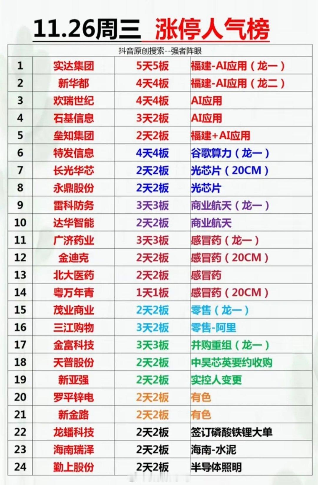 11.26周三 成交活跃个股 涨停人气榜!实达集团:5天5板 福建-AI应用(龙一) 新 华 都:4天4板 福建-AI应用(龙二) 欢瑞世纪:4天4板 AI应用石基信息:3天2板 AI应用垒知集团:2天2板 福建+AI应用特发信息icon:4天4板 谷歌算力(龙一) 长光华芯icon:2天2板 光芯片(20CM) 永鼎股份icon:2天2板 光芯片雷科防务:3天3板 商业航天(龙一) 达华智能icon:2天2板 商业航天广济药业:3天3板 感冒药(龙一)
