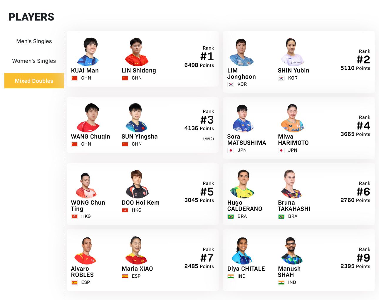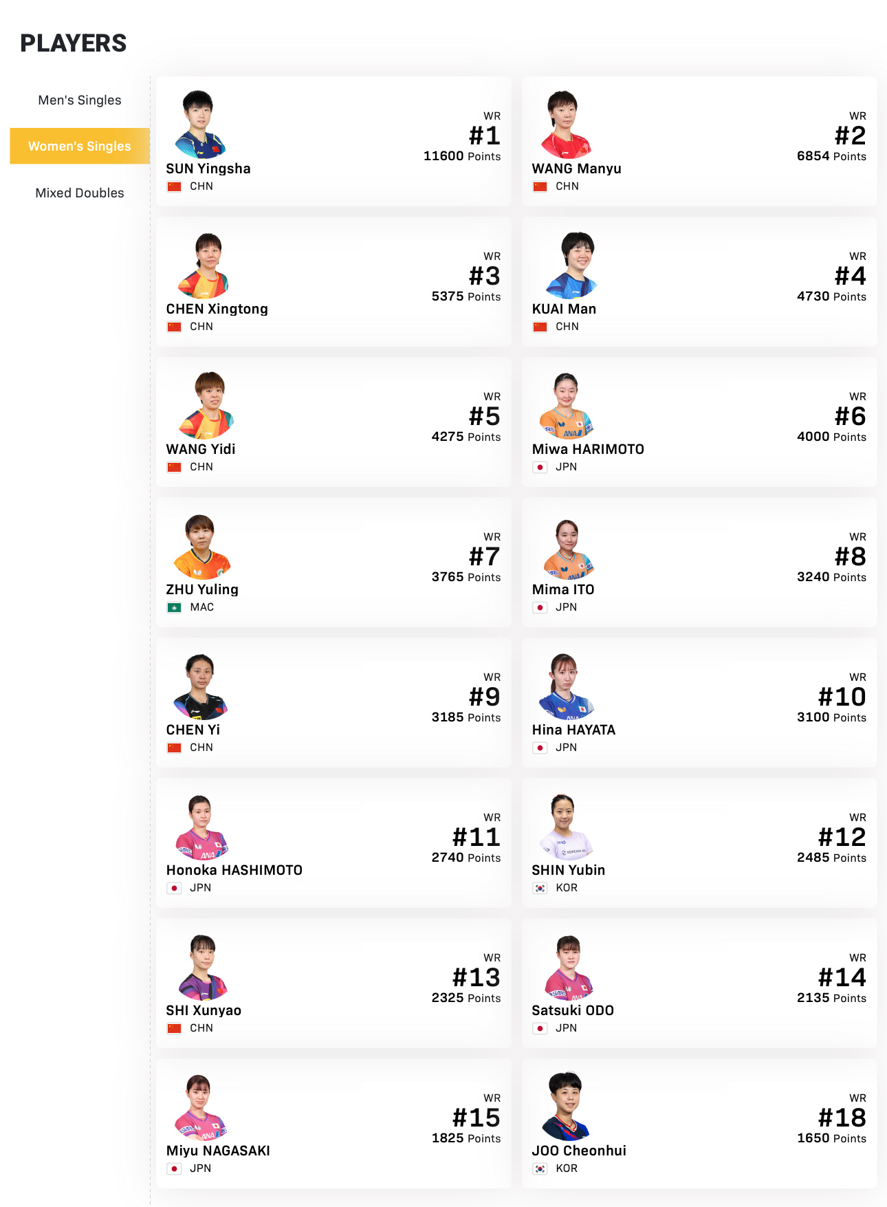 2025WTT香港总决赛参赛名单【男单】王楚钦🇨🇳,林诗栋🇨🇳,卡尔德拉诺🇧🇷,莫雷加德🇸🇪,张本智和🇯🇵,F勒布伦🇫🇷,梁靖崑🇨🇳,松岛辉空🇯🇵,邱党🇩🇪,A勒布伦🇫🇷,向鹏🇨🇳,杜达🇩🇪,林昀儒(中国台北),安宰贤🇰🇷,林德🇩🇰,高兹🇫🇷【女单】孙颖莎🇨🇳,王曼昱🇨🇳,陈幸同🇨🇳,蒯曼🇨🇳,王艺迪🇨🇳,张本美和🇯🇵,朱雨玲🇲🇴,伊藤美诚🇯🇵,陈熠🇨🇳,早田希娜🇯🇵,桥本帆乃香🇯🇵,申裕斌🇰🇷,石洵瑶🇨🇳,大藤沙月🇯🇵,长崎美柚🇯🇵,朱芊曦🇰🇷【混双】林诗栋/蒯曼🇨🇳、林钟勋/申裕斌🇰🇷、王楚钦/孙颖莎🇨🇳、松岛辉空/张本美和🇯🇵、黄镇廷/杜凯琹🇭🇰、卡尔德拉诺/高桥布鲁娜🇧🇷、罗布勒斯/肖瑶茜🇪🇸、沙/奇塔莱🇮🇳