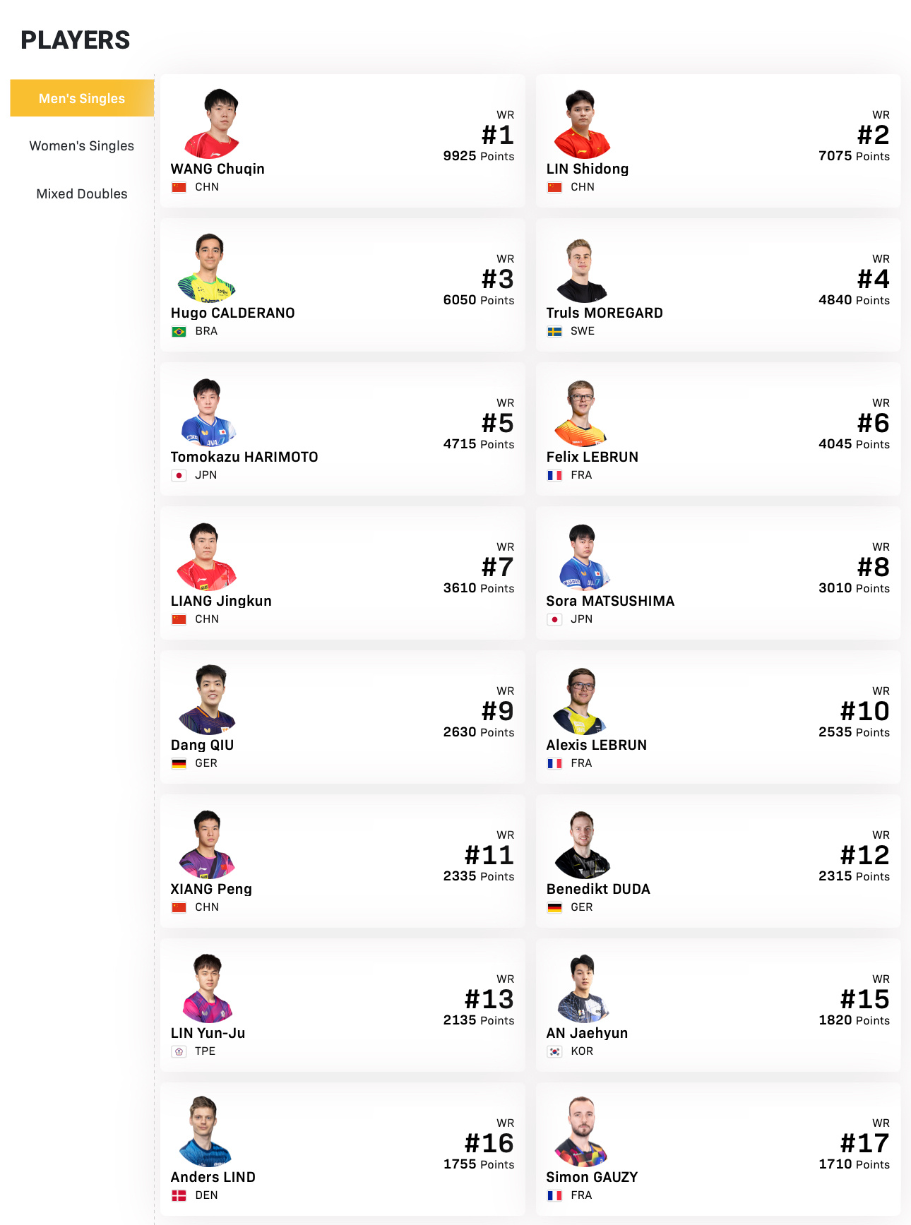 2025WTT香港总决赛参赛名单【男单】王楚钦🇨🇳,林诗栋🇨🇳,卡尔德拉