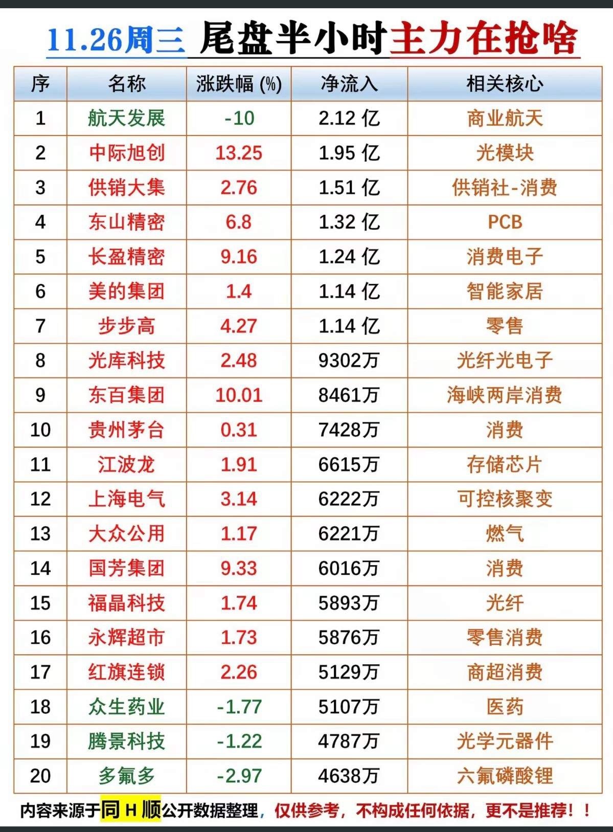 11.26周三 尾盘半小时 主力在抢筹啥?从数据监测来看,主要是消费,零售。另外,消费电子,商业航天,PCB受到资金关注,有的是主力做日内差价,早盘卖,尾盘在低价买回。