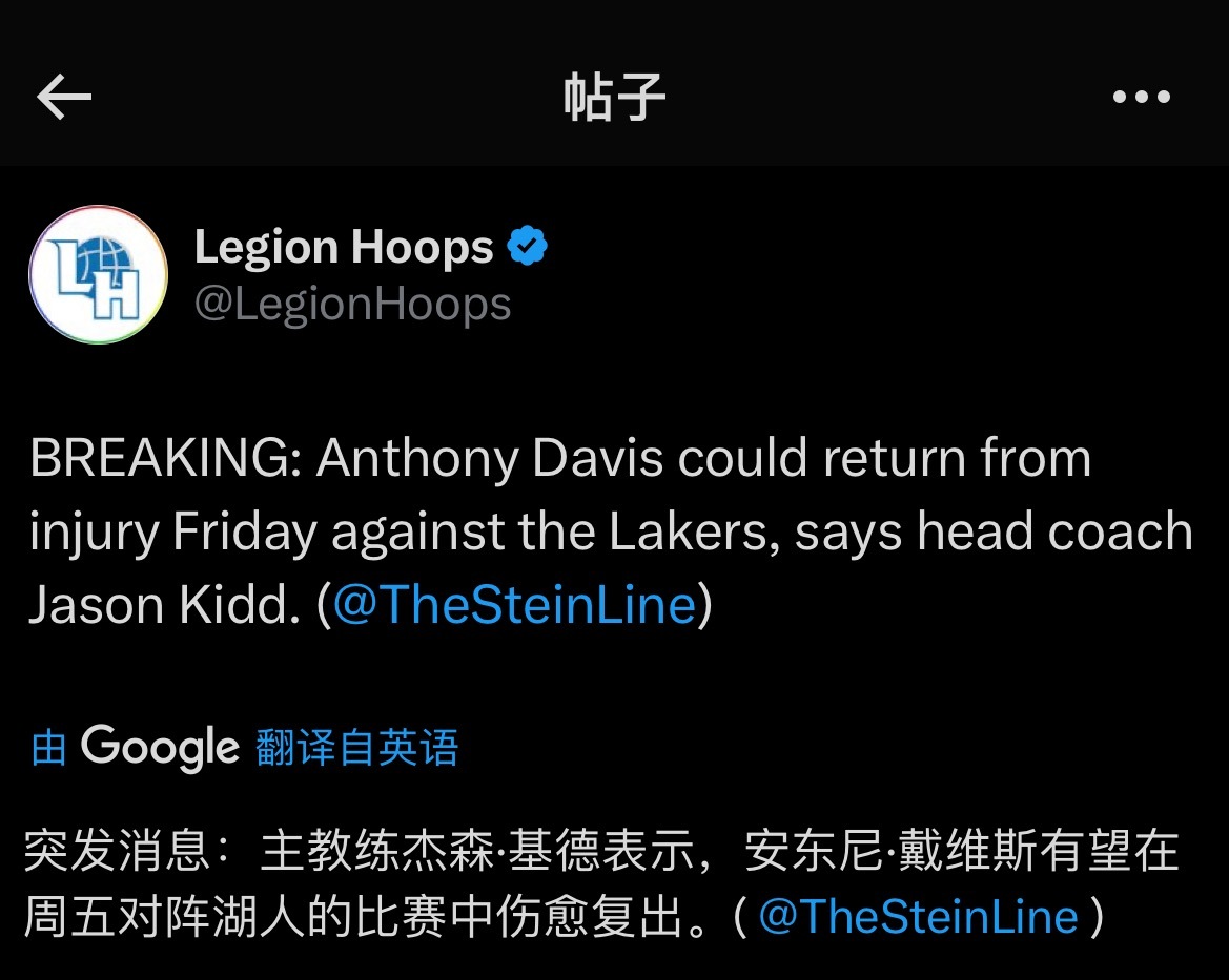 基德表示,浓眉有望在对阵湖人的比赛中迎来复出!洛杉矶湖人勒布朗詹姆斯