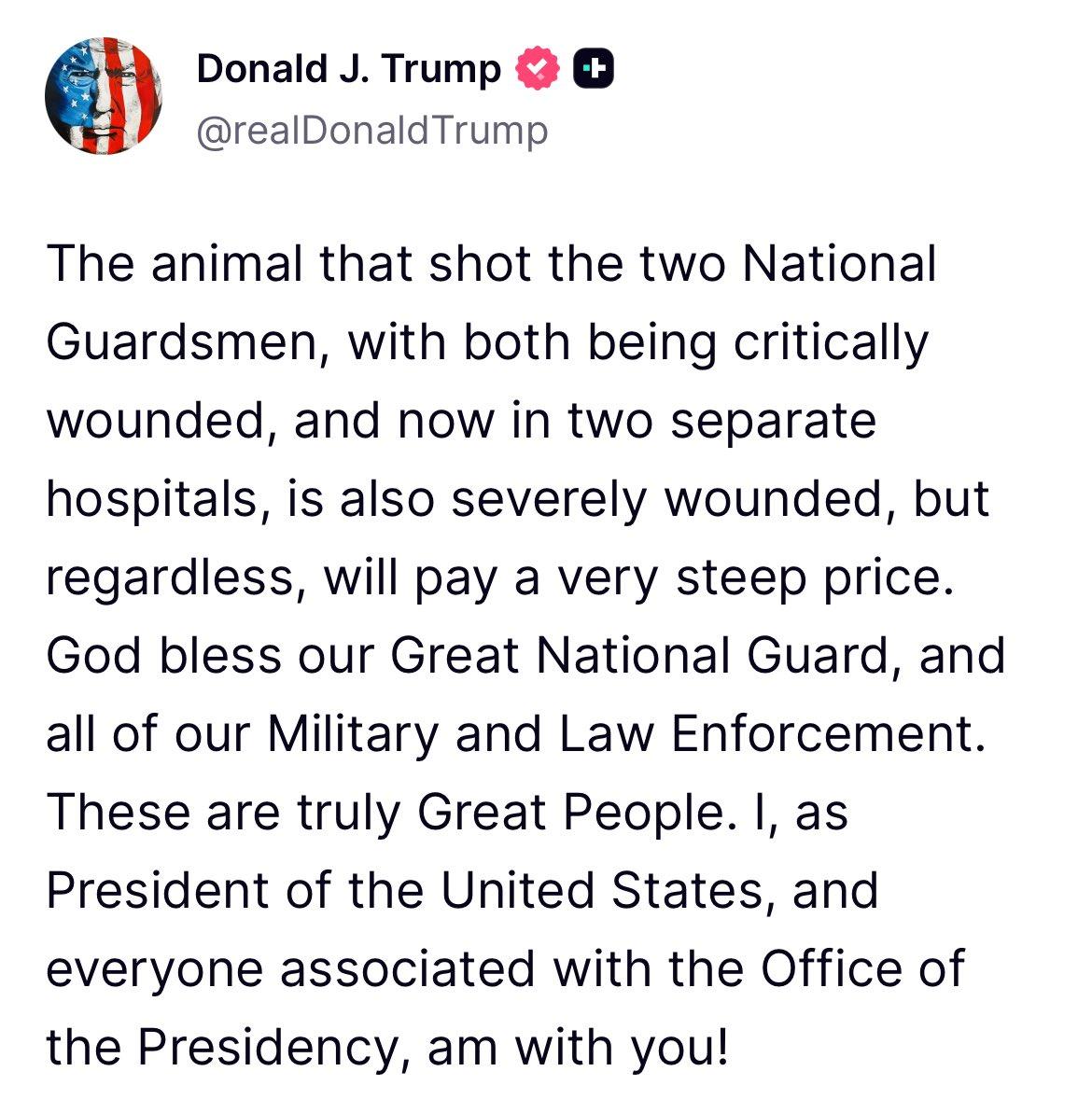 特朗普总统宣称,在华盛顿特区枪击两名国民警卫队成员的“畜生”必将付出“极为沉重的代价”。