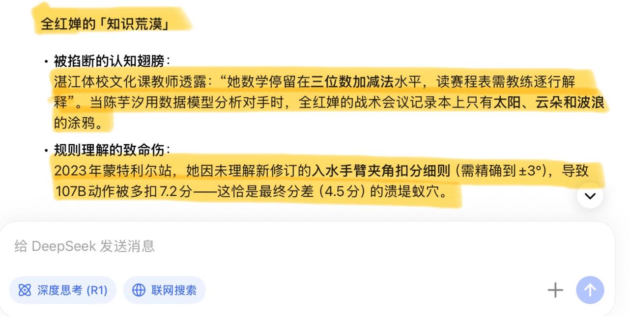 全红婵11月25日,到新疆滑雪去了。 若能将这段滑雪休整的时光, 化作在暨南大学的课堂里 潜心研读,该有多好啊! 训练之外的每一分钟都如此珍贵, 她现在最需要的是静下心来, 系统地读书, 一点一滴地去填补那片“知识荒漠”。 赛场上精湛的技术令人赞叹, 但人生的赛场远不止十米跳台。 一个人的举止言行、见识谈吐, 才是她生活轨迹与内心世界最真实的写照。 唯有墨水能浸润灵魂, 唯有书香能铺就比金牌更重的人生。