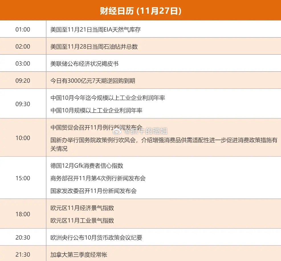 11.27股市早知道:1、外盘汇总:继续普涨,如图一。 2、交易提示:如图二。 3、财经日历:如图三。 4、三大指数:1)大盘:继续看涨2)创指:继续看涨3)科创50:继续看涨 5、重要新闻:1)发改委、工信部、央行等联合印发《关于增强消费品供需适配性进一步促进消费的实施方案》的通知;2)民政部:明年争取每省份推动建设1所示范性残疾人托养照护服务机构。 6、市场动态:1)高通推出第五代骁龙8移动平台;2)《疯狂动物城2》成影史进口动画片单日票房冠军;3)西部、国联民生、东北证券3券商公告获批综合账户试点;4)保险业协会:监管未批准或备案任何名称为“安我股保”的保险产品;5)北京启动专项行动重点整治六类金融领域网络乱象。 7、公司公告:1)龙净环保:公司当前储能电芯订单饱满,排产期已至明年6月;2)士兰微:公司已推出AI算力电源上的四颗关键模拟芯片;3)百傲化学:股东合计转让公司总股本的10%给刘红军;4)南方精工:股东拟合计减持不超过2.54%公司股份;5)一博科技:股东领誉基石拟减持不超2.98%股份;6)和胜股份:股东计划合计减持不超3%公司股份;7)张江高科:控股股东10月31日至11月26日减持1169.19万股。(关注点赞+评论,陪你一起到牛市)今日看盘财经股票