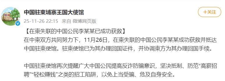 【#柬埔寨大使馆通报仝卓表弟已获救#】11月26日,发文:在中柬双方共同努力下,11月26日,在柬失联的中国公民李某某成功获救并抵达中国驻柬使馆。驻柬使馆已为其办理回国证件,并协调柬方为其办理回国手续。中国驻柬使馆再次提醒广大中国公民提高反诈防骗意识,坚决抵制、防范“高薪招聘”“轻松赚钱”之类的招工陷阱,以免上当受骗、危及自身安全。
