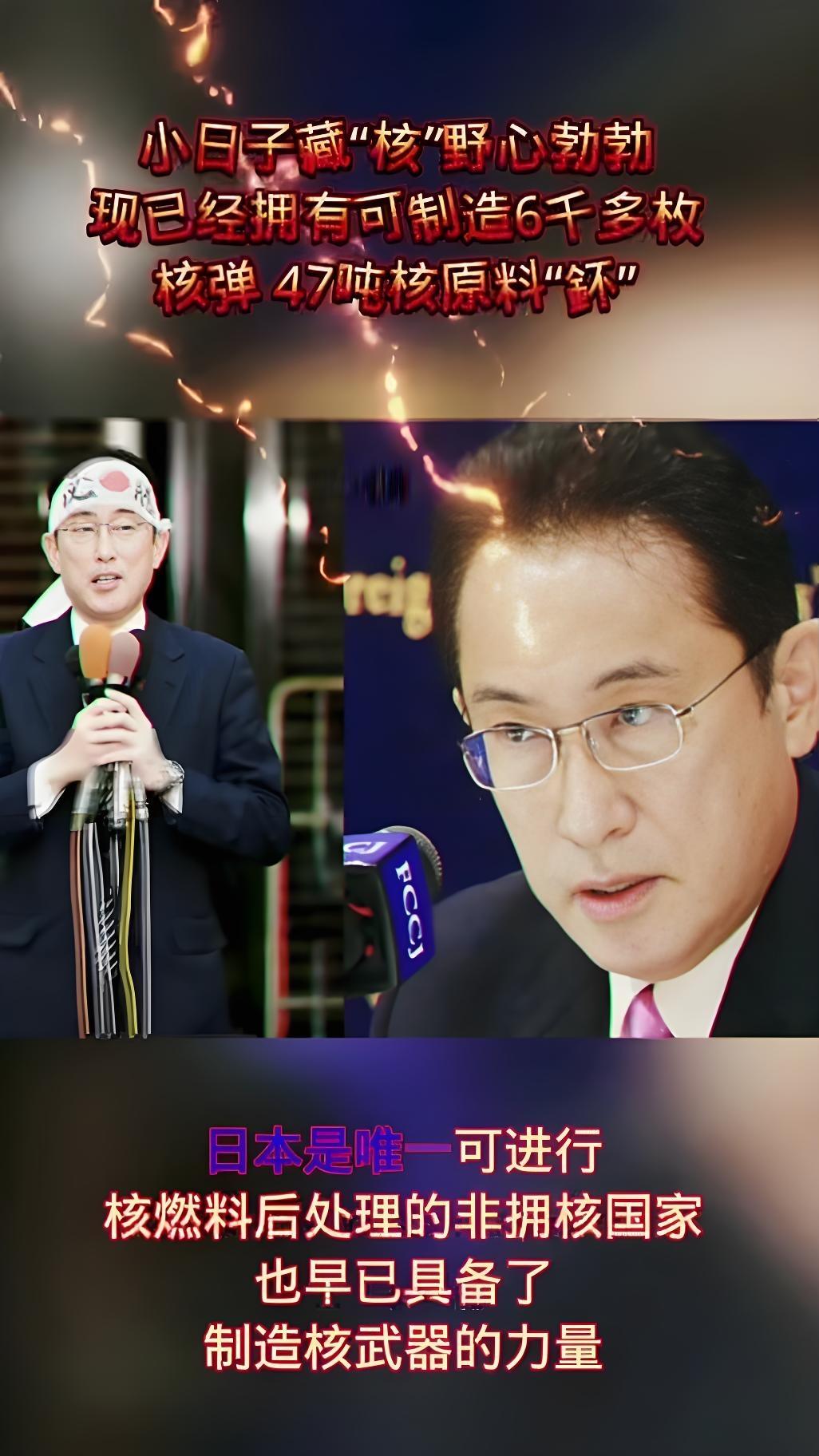 别被“无核”骗了! 日本手握造6000枚核弹的料,基辛格早预言要拥核? 别再被日本“无核国家”的幌子骗了,这货早偷偷攒够造核武的本钱。国际原子能机构2025年数据显示,日本囤了47.8吨分离钚,其中10吨达武器级,按每枚核弹需6-8公斤钚算,理论上能造6000枚,还在以每年2.6吨的速度新增。更关键的是,日本有完整核燃料循环技术,前防卫次官直言半年就能让核武实战化。 美国前国务卿基辛格早预言,日本或2028年前拥核,如今它连“无核三原则”都想改,这野心藏不住了,周边国家必须盯紧。