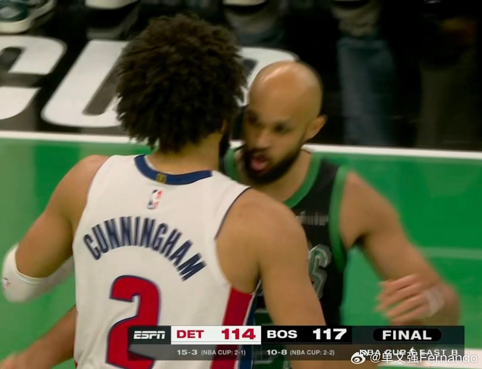 波士顿凯尔特人!!!终结东部第一13连胜!!!Celtics在刚刚NBA杯的比赛117-114险胜底特律活塞,最后几秒玩“点球”,结果差点玩脱,不过活塞Cade坎宁安3罚2中,凯尔特人虚惊一场拿下!!!杰伦·布朗33分10篮板5助攻2断2帽德里克·怀特27分7篮板3助攻6三分球普理查德16分5篮板!JB现在真的能抗产量,这就很不容易了!活塞今天CC还是很持球大核心的数据42分8篮板5助攻16罚14中!