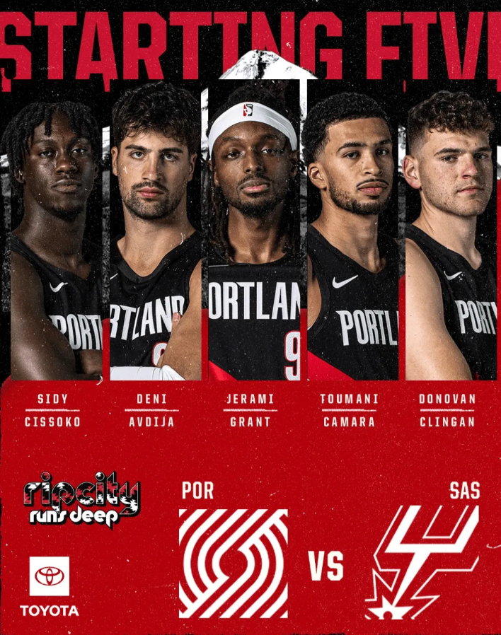 NBA杯小组赛,开拓者将主场对阵马刺。 开拓者本场首发:德尼-阿夫迪亚、杰拉米-格兰特、图马尼-卡马拉、西迪-西索科、多诺万-克林根。 本场比赛将于11:00开始。
