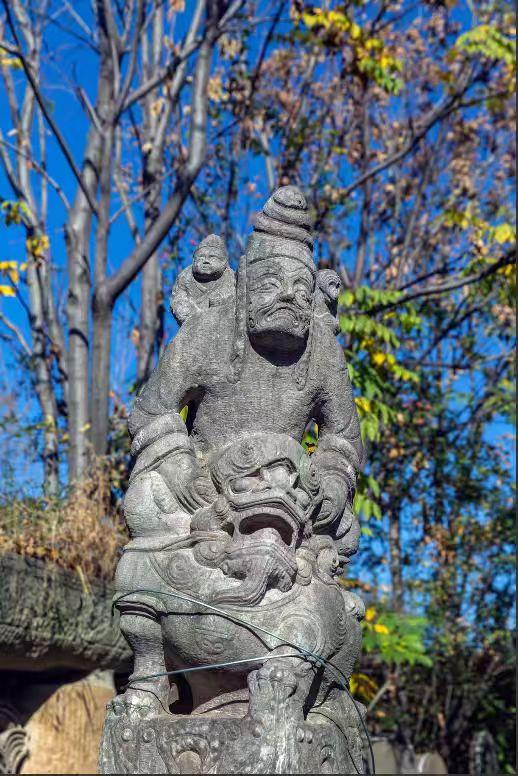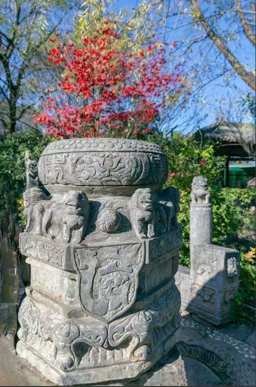 石墩上的石狮衔着旧时光,红叶泼泼洒洒,把古意染得鲜活。岁月在纹路里长了青苔,风一吹,是秋光裹着的老故事。 石匠把威风刻进纹路里,神将驮着稚童,石狮衔着秋光。岁月磨圆了棱角,却没褪掉这半分鲜活——像旧时光里,刚藏好的一捧烟火气。