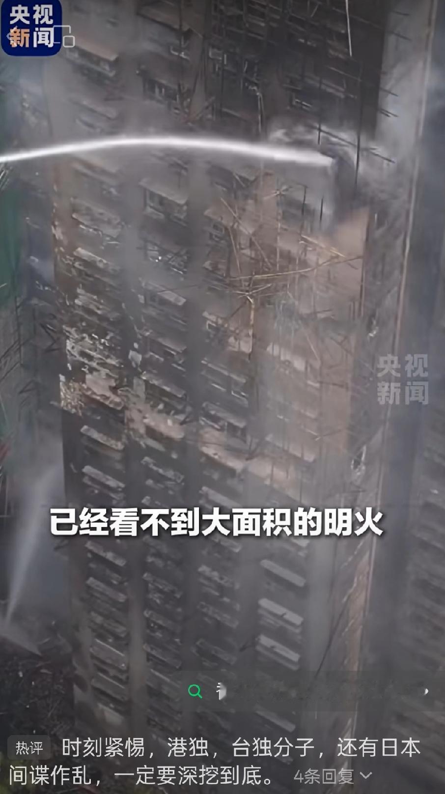 央视最新报道: 香港大埔火灾现场 目前起火大楼看不到大面积明火,火势已得到基本控制,救火工作预计持续到今天傍晚结束。 这场火灾 看的咱们14亿同胞都揪心! 愿香港同胞平安顺利安好[祈祷] 愿消防员注意安全平安回家[祈祷] 愿大家都平平安安[祈祷][祈祷][祈祷]