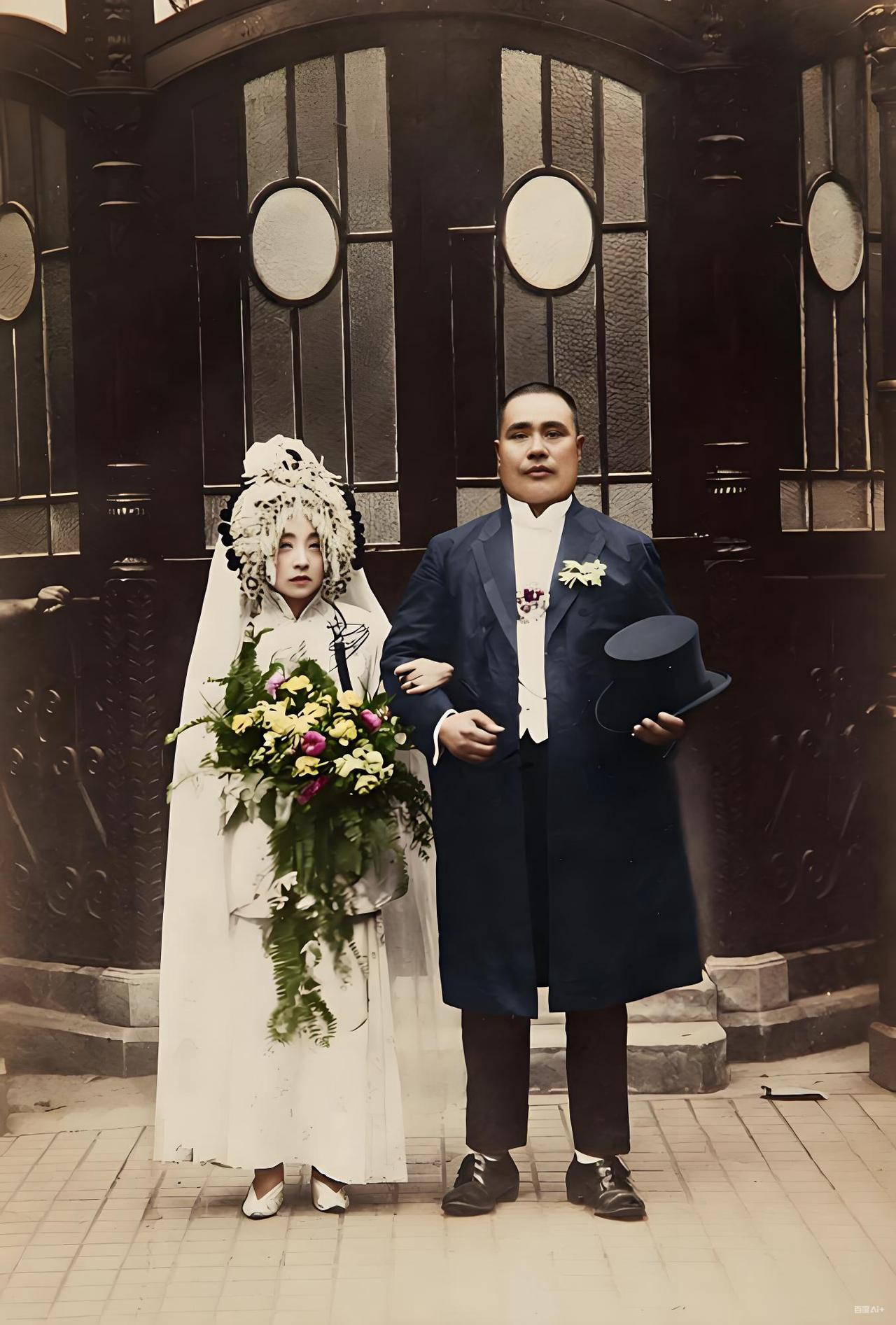 1918年,赛金花与第三任丈夫魏斯炅在上海举办新式婚礼,赛金花穿西式婚纱配中式珠花头饰、魏斯炅着全套西式礼服。 魏斯炅是民国初年的前参议院议员、江西籍士绅,在上海的政界与商界圈层有一定影响力,与赛金花相识时已过中年,对其过往经历(从名妓到曾随洪钧出使欧洲的公使夫人)持包容态度。 这场婚姻是赛金花人生中第三次结合,她的一生身份跌宕(名妓、公使夫人、普通已婚女性),这张照片是她少有的“世俗安稳”时刻的记录。