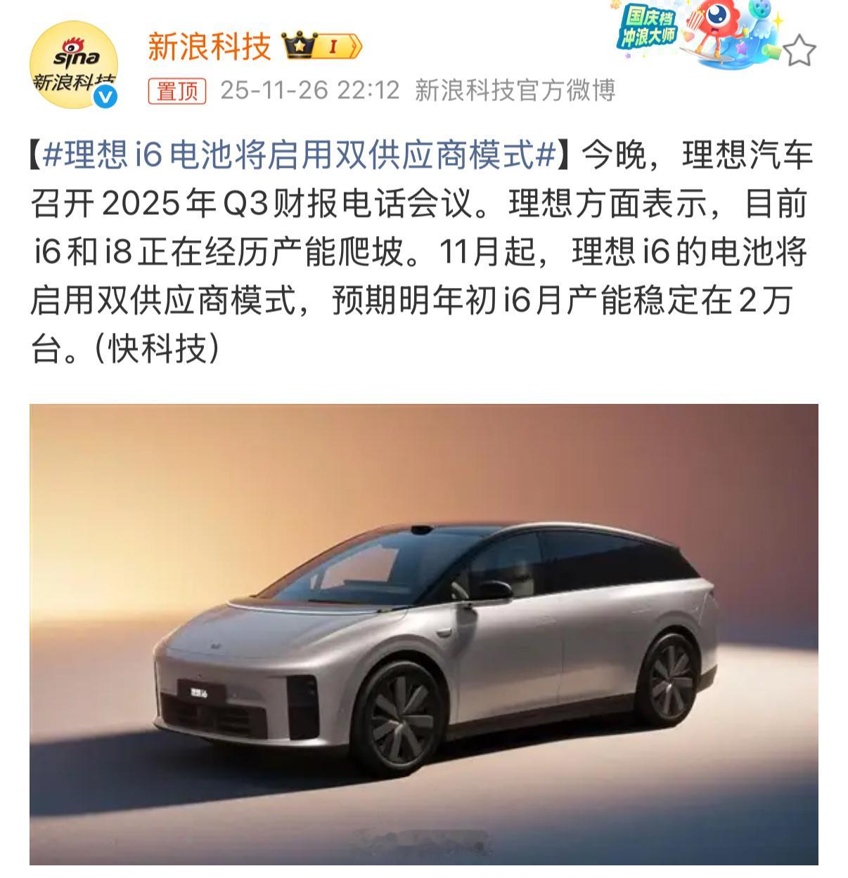 理想i6电池将启用双供应商模式我觉得主要目的是提升产能吧。也从侧面说明理想纯电系列销量的火爆和理想对未来纯电系列的自信。刚刚还有朋友问我理想i8怎么样,我已经强烈推荐了。