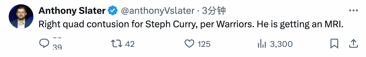 斯蒂芬·库里是右股四头肌挫伤。他正在接受核磁共振检查(MRI)Right quad contusion for Steph Curry, per Warriors. He is getting an MRI. 库里一瘸一拐退场