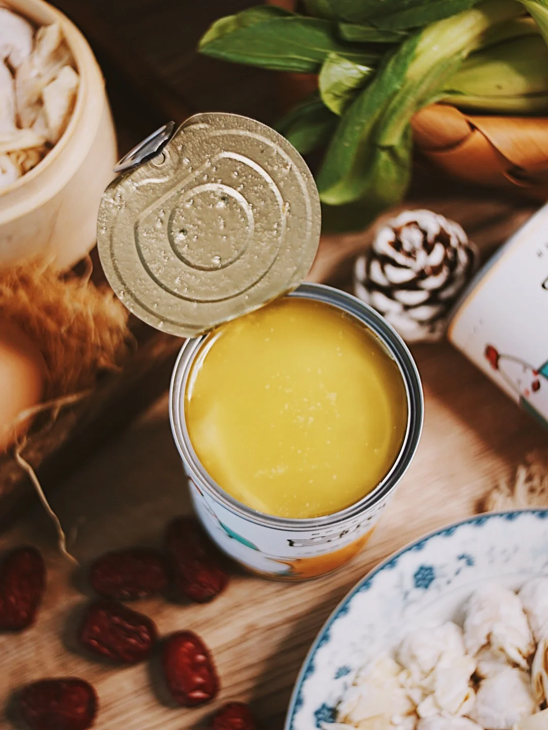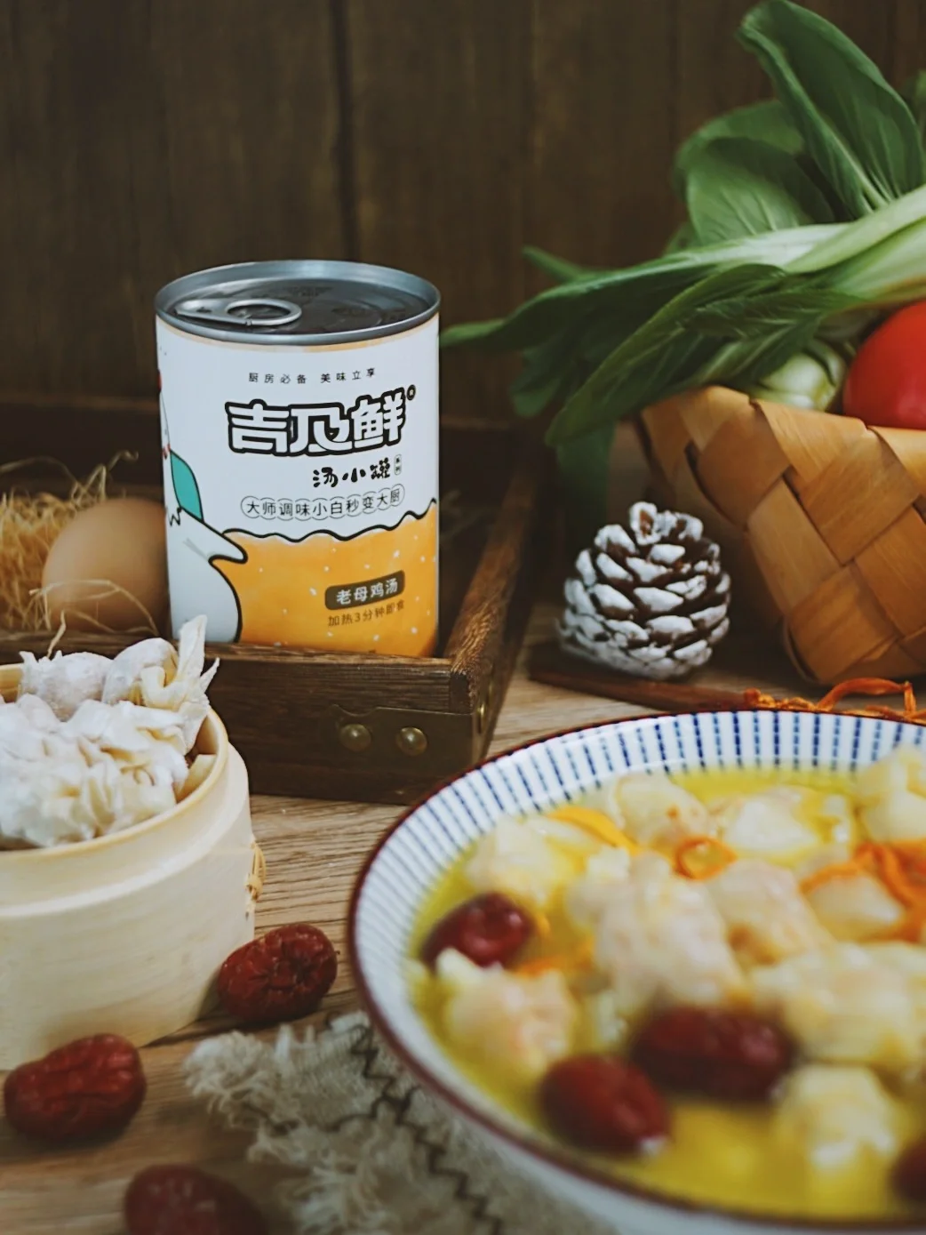 拉开拉环,把吉及鲜的老母鸡汤倒入锅里