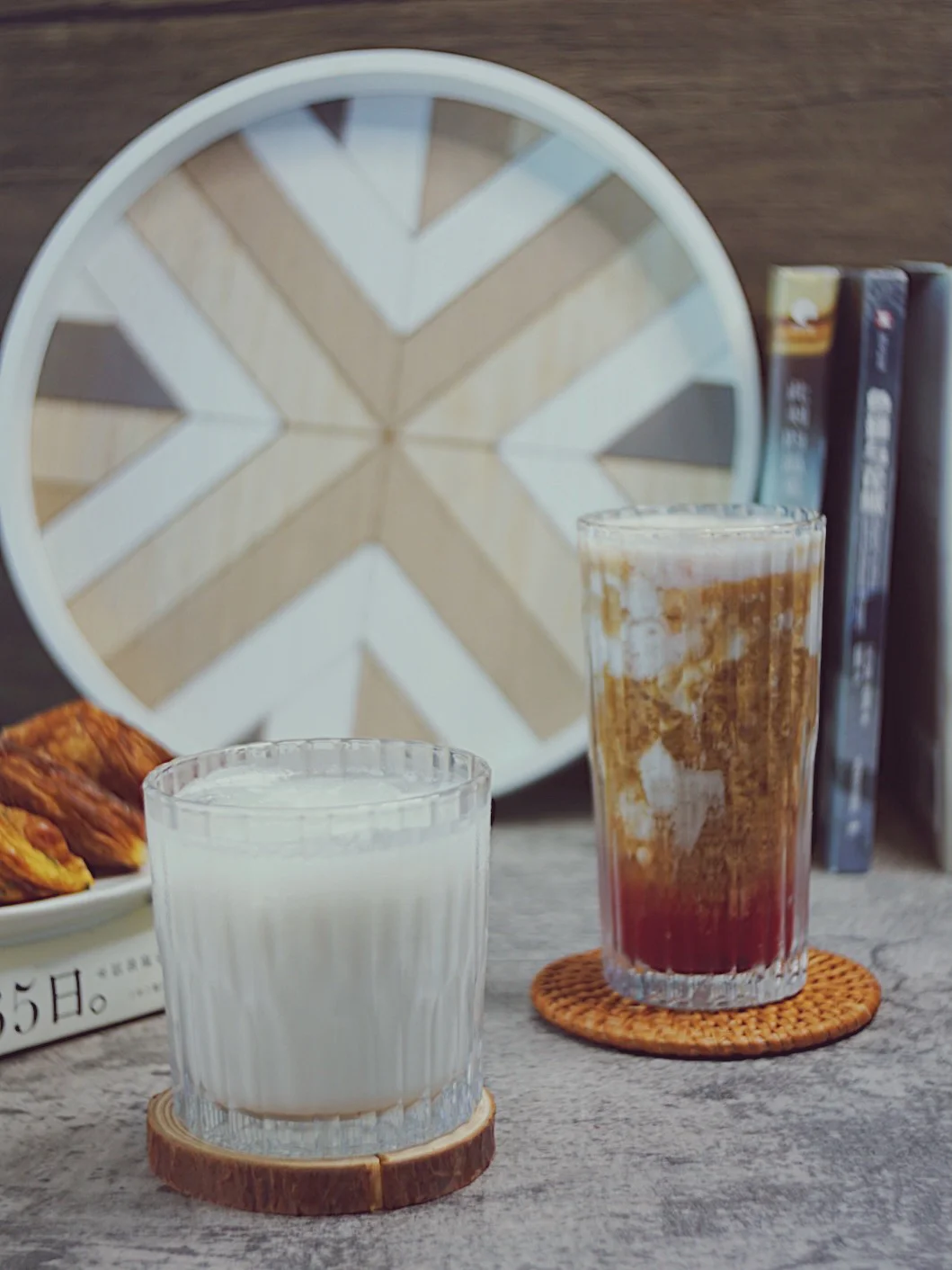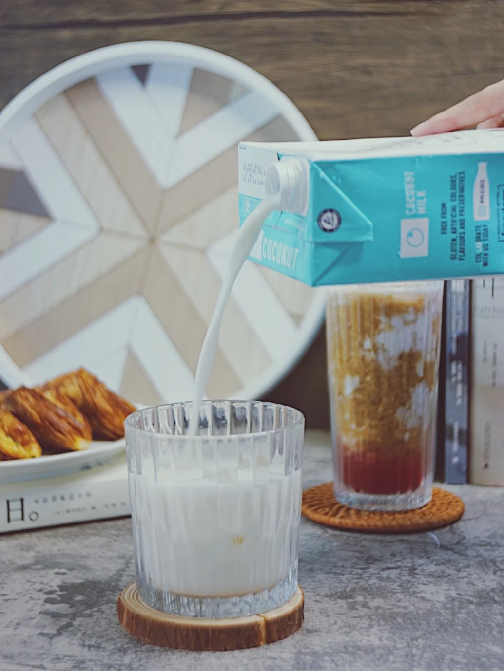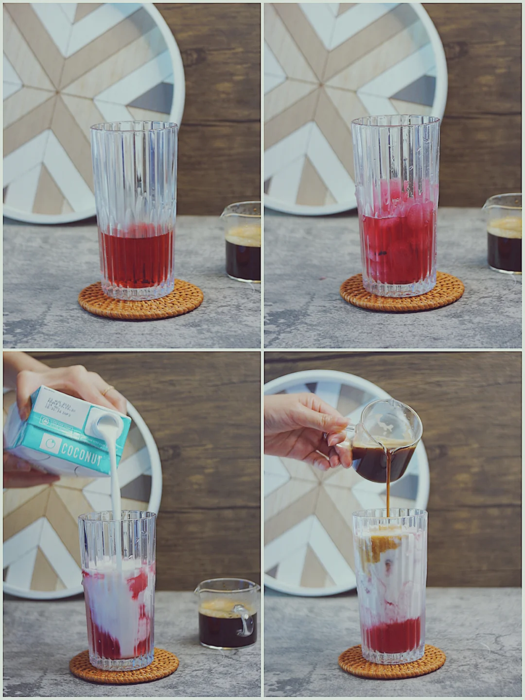 ©️再依次倒入冻好的朗姆果茶冰块、椰奶、意式浓缩咖啡