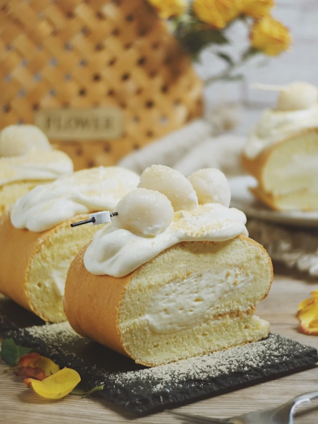 7️⃣组装:蛋糕卷切掉头和尾,平均分成4段。淋上豆乳奶酪淋酱,白玉丸子穿成串。放在淋酱上,表面撒上黄豆粉