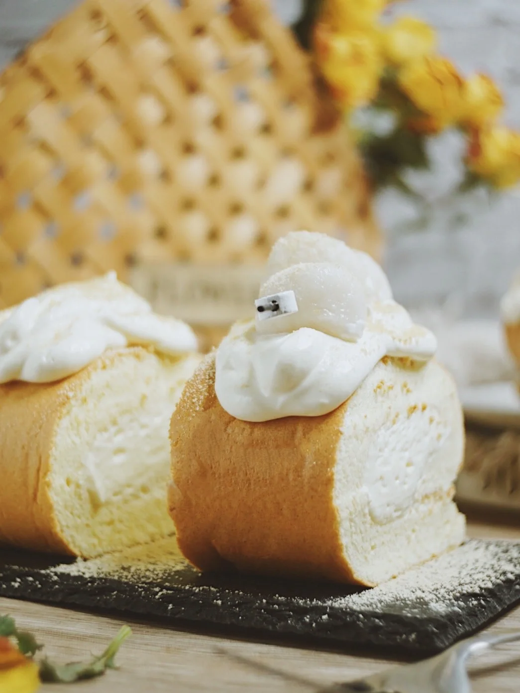 4️⃣软化好的奶油奶酪与细砂糖和豆奶粉一起搅打顺滑,倒入淡奶油继续搅打至有清晰纹路的状态,抹在烤好的蛋糕胚上,卷起的一头整型成图中的样子。利用擀面杖卷起,放冰箱冷藏定型。