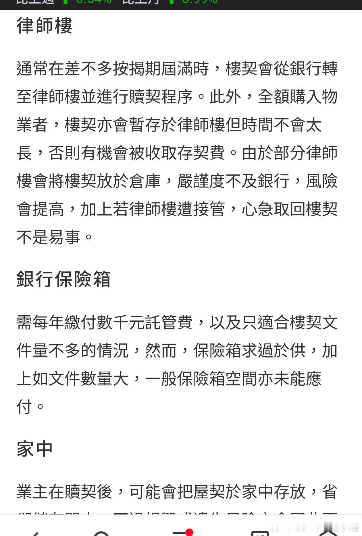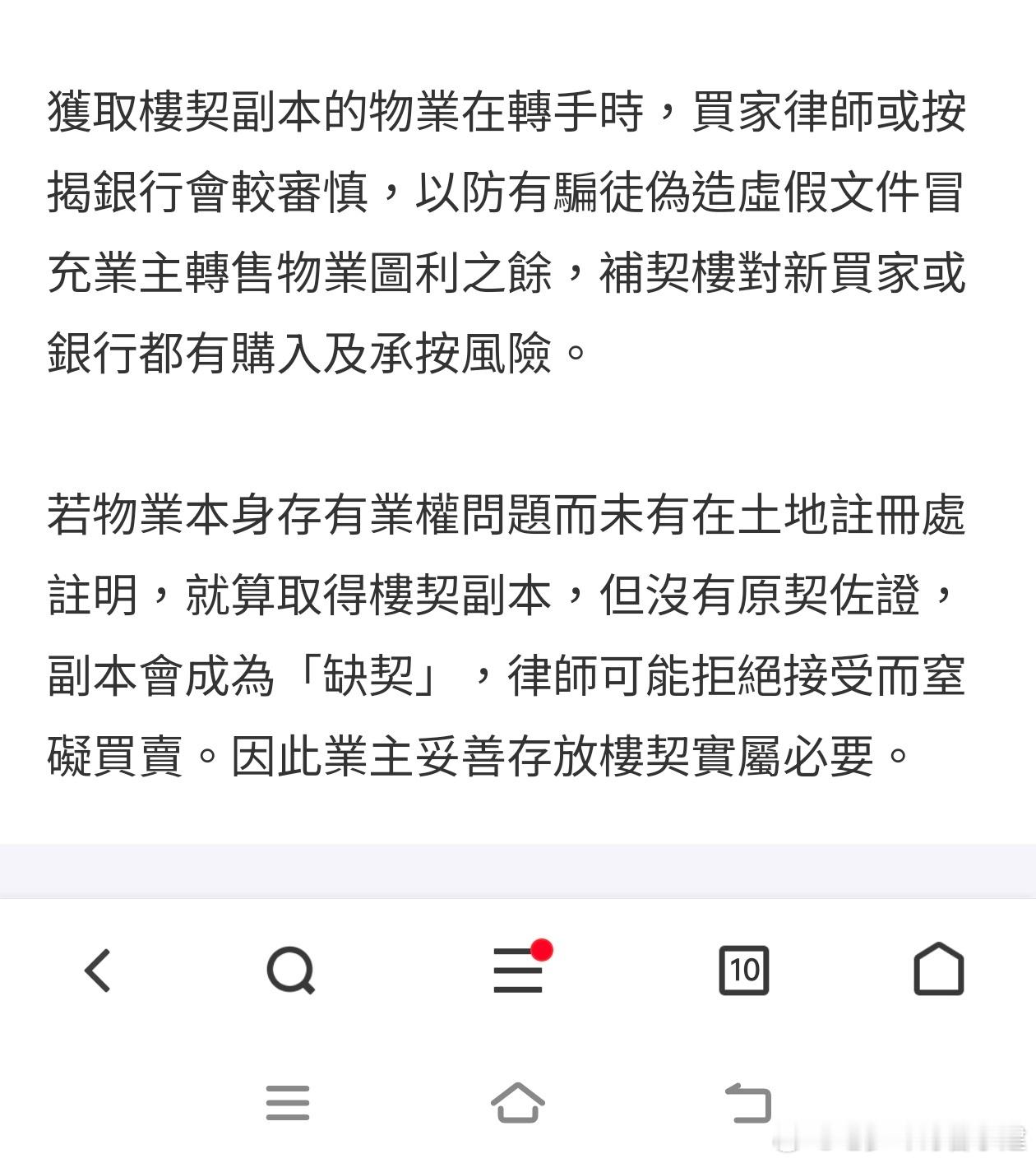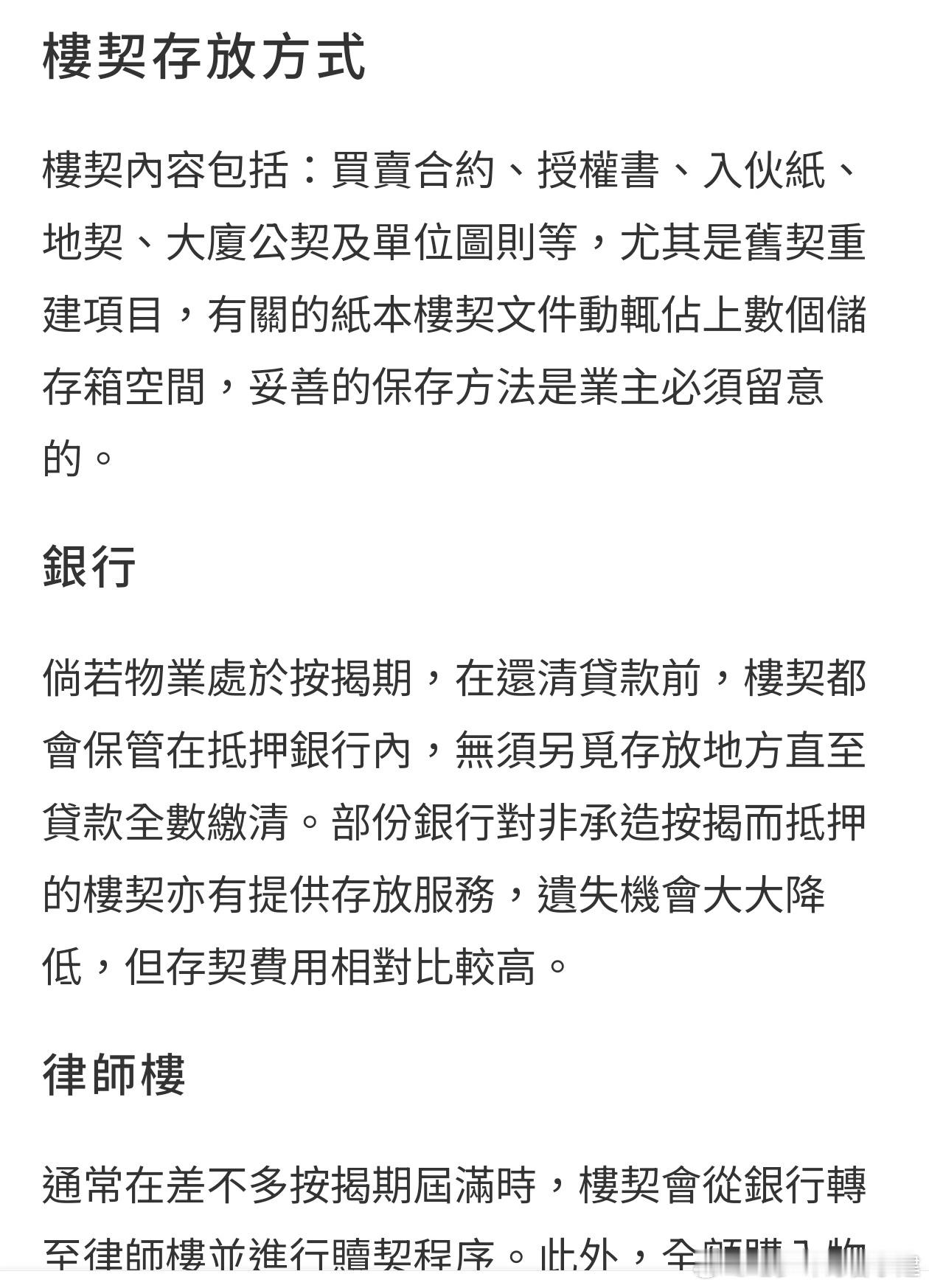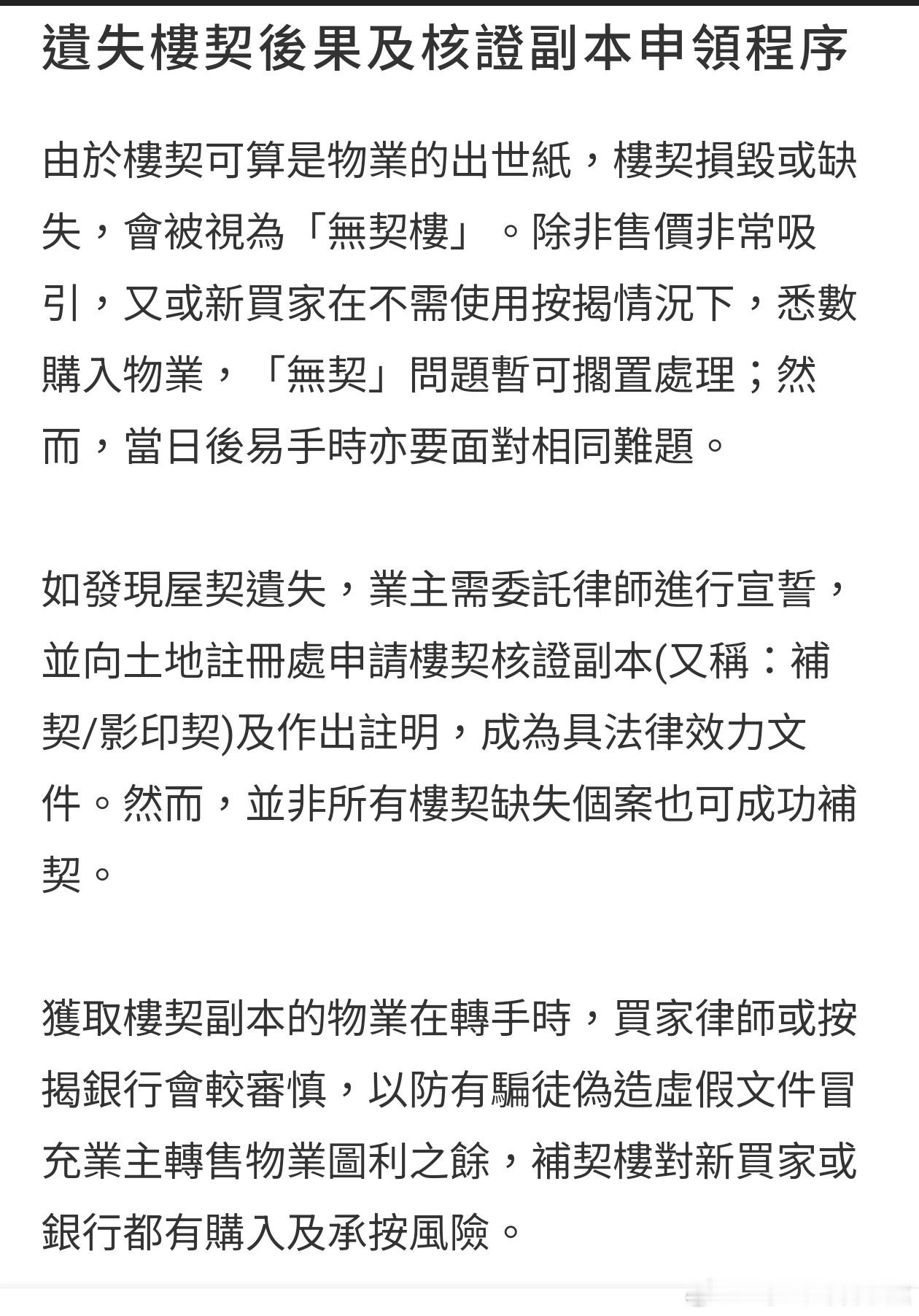 很多人问香港地契存放方式,以及遗失能不能补办问题地契可以自行存放家中、银行保管,保险箱保管。后两者要收取费用那么遗失地契如何?你要去律师行声明你遗失了地契,同时向香港土地注册处申请原有地契的 复印件(并做出注明),复印件有法律效力,但是也不是所有地契都能补办复印件重要一点来了:如果你只是拿着地契复印件自住,那你就安心住着,房子还是你的。因为你走完了法定程序。一旦涉及房子二次交易,买家律师或者银行一般比较谨慎,他会担忧会不会有骗徒造假,拿个假证明冒充业主图利。会对你进行严谨审核。如果房子本身具有所有权争议你又没有在土地注册处登记说明,而你又没有原始地契作证房子物有权是你的,你房子会变成“无契房”,买方律师直接可以拒绝交易。哦,对了,你每交易一次房就要有合同作为证明,交易几次有几张。通通都要保管好