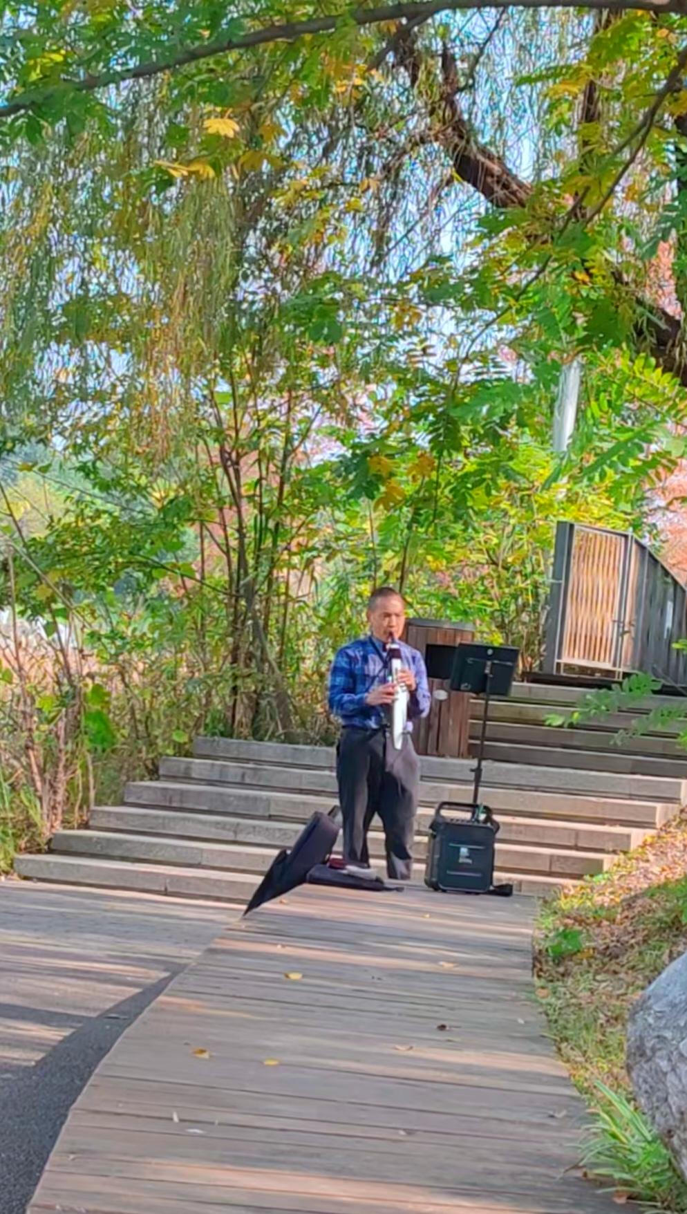 电吹管即兴一曲。清风拂面,绿意环绕,悠扬旋律随风飘荡。此刻身心沉醉,自得其乐,恰