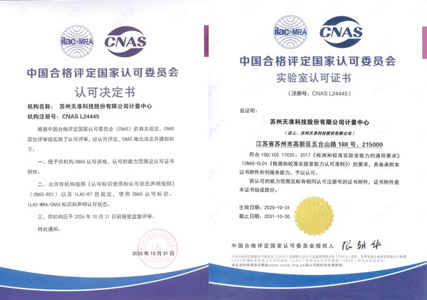 苏州2025年11月27日--近日,苏州天准科技股份有限公司计量中心通过中国合格评定国家认可委员会(CNAS)评审,正式获颁实验室认可证书(注册号:CNASL24445)。这标志着天准计量中心的技术实力与质量管理体系不仅获得国家级权威认证,更取得了国际互认的"通行证",为天准的技术创新构筑起通向全球市场的坚实基石。