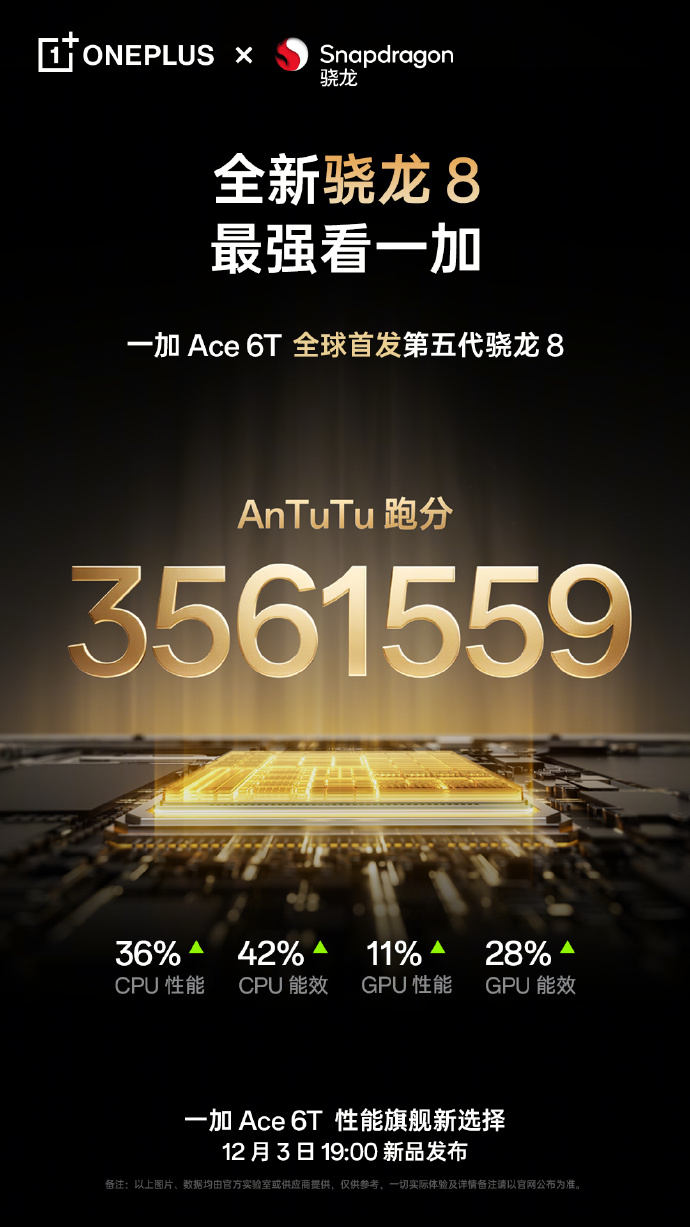 一加Ace6T全球首发第五代骁龙8旗舰芯片,安兔兔跑分突破356万
