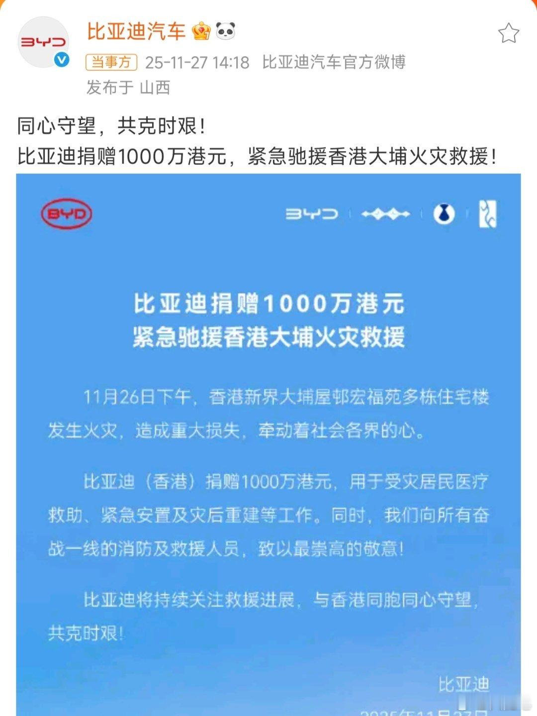多家车企为香港火灾捐款 这才是大车企的担当,希望这些钱可以帮助到香港受灾群众,也希望大家都平安。