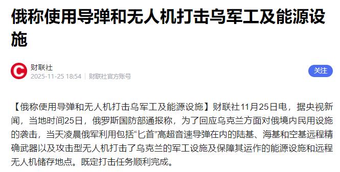 俄军动真格了! 11月25日俄军突袭乌军,官方消息称此举是回应乌方袭俄民用设施。“匕首”高超音速导弹领衔,陆、海、空远程武器齐发,精准打击乌军工设施、能源基地及无人机储存点,所有目标均被击中。 这次俄军是真没留余地,压箱底的家伙全亮出来了。最显眼的就是那“匕首”高超音速导弹,这玩意儿可不是摆着看的花架子。 一秒钟能飞3公里多,速度是音速的10倍,2000多公里的射程,打哪儿指哪儿,精度能控制在10米以内。 更厉害的是它能在空中变轨,末段还能近乎垂直往下扎,北约的“爱国者”防空系统就算发现了,也根本来不及反应。 之前11月10号,俄军就用它端掉过乌克兰国防部的电子情报中心,这次更是直接当起了打击先锋。 不光是空天军的“匕首”,陆军的“伊斯坎德尔”导弹、海军的“口径”巡航导弹也一起发力,从陆地、海上、空中织了张火力网,专挑乌克兰的要害戳。 这些打击目标选得特别有讲究,不是瞎炸一气。军工设施是乌克兰造武器的根儿,能源基地关系着冬天取暖和武器运转,无人机储存点更是他们用来袭扰俄罗斯的“弹药库”。 之前俄罗斯还总想着留几分余地,可乌克兰仗着西方援助,无人机越搞越先进,盯着俄民用设施打个没完,这次俄军是真的不想再退了。从效果来看,这招确实管用。 俄罗斯国防部反复强调,打的都是军事目标,问题出在乌克兰那边——他们故意把军工车间、无人机仓库建在居民区里,把老百姓当成“挡箭牌”。 之前有个乌军战俘就说了,他们的指挥所常设在学校、居民楼里,连运兵都用标着“校车”的车,这明显违反了《日内瓦公约》。 就像乌克兰之前袭击喀山时专门盯着居民区炸,这种不按规矩来的打法,才是无辜民众受难的真正根源。俄军这波反击,本质上是在护着自己的老百姓不受欺负。 可能有人会问,这么猛的火力,不是让冲突更升级了吗?其实反过来想,俄军这次把火力拉满,骨子里是想给冲突降降温。 用最硬的拳头让对方明白,袭击民用设施的代价有多高,反而可能逼着双方早日坐回谈判桌前。 “匕首”导弹飞得再快,也快不过两国老百姓盼和平的心思;远程武器威力再大,也大不过大伙儿对安稳日子的渴望。 说到底,11月25号的这场突袭,是自卫,更是警告。 战争里最该被护着的是平民,最该守住的是人道主义底线。谁要是敢突破这个底线,把无辜民众卷进来,就必然会遭到最猛烈的回应。 希望这记重拳能让双方都冷静下来,大伙儿心里都清楚,再厉害的武器,也换不来家里暖烘烘的暖气;再响亮的口号,都不如餐桌上一碗热乎饭实在。 对俄乌两国人民来说,和平才是最该一起争取的目标。