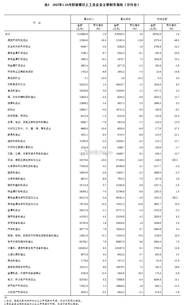 今年1-10月利润增长10%以上的行业(来源:国家统计局数据,钢铁行业上一年度同期亏损,没有包括)1.有色金属矿采选业利润1050.6亿,同比增长33.3%;2.铁路、船舶、航空航天和其他运输设备制造业利润1126亿,同比增长32%;3.废弃资源综合利用业利润161.3亿,同比增长28.6%;4.有色金属冶炼和压延加工业利润2891.7亿,同比增长14%;5.酒、饮料和精制茶制造业利润2610.2亿,同比增长13.7%;6.电力、热力生产和供应业利润6264.8亿,同比增长13.1%;7.计算机、通信和其他电子设备制造业利润5700.4亿,同比增长12.8%