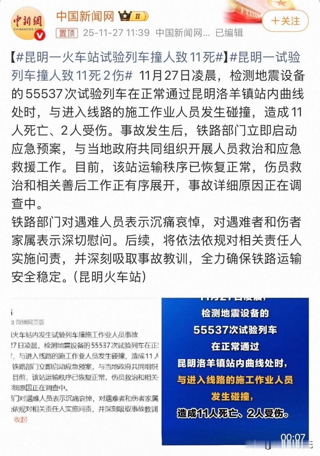 同一天内,四川德阳与云南昆明相继发生两起列车与施工人员碰撞的悲剧,共造成13人遇难、2人受伤。 · 德阳事故:11月27日凌晨,宝成铁路一列货运列车(车次21016)在运行中碰撞两名铁路维护人员,致其死亡。 · 昆明事故:同日凌晨,一列检测地震设备的试验列车(车次55537)在昆明洛羊镇站内与施工作业人员相撞,造成11人死亡、2人受伤。 两起事故原因仍在调查中,铁路部门已启动应急响应并开展善后工作。一日两起悲剧,铁路施工安全再次敲响警钟! 🚨