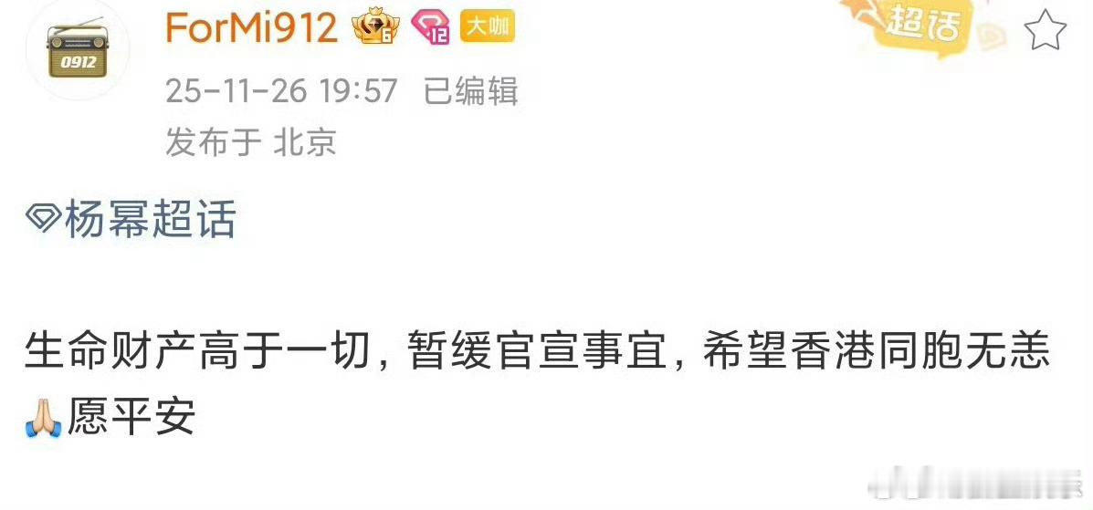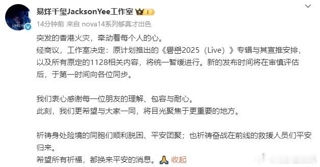 多位艺人暂缓官宣26日下午,香港新界大埔屋邨宏福苑多栋住宅楼发生火灾,造成重大人员伤亡,不少演艺界人士宣布延期或取消个人活动,希望把公共注意力留给救援。原定于11月28日及29日将举行2025 Mnet亚洲音乐颁奖礼(MAMA),现主办方举行紧急会议,节目组将取消火焰舞台、红毯、大型特效等环节,并在开场增设默哀仪式,原定出席的杨紫琼、周润发等多位嘉宾将有可能不出席活动,颁奖礼将按计划录制,但延后播出。香港迪斯尼乐园也取消《疯狂动物城2》首映礼。杨幂、易烊千玺、檀健次、田曦薇、梓渝等艺人也暂缓相关宣发计划。