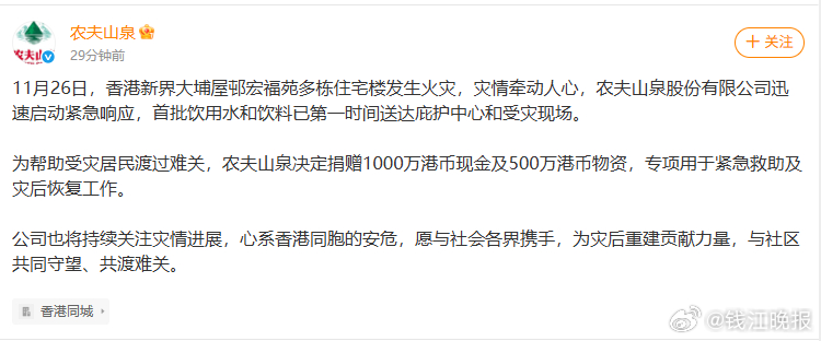 【#农夫山泉捐1500万港币物资驰援香港#】11月27日,为帮助香港火灾受灾居民渡过难关,农夫山泉决定捐赠1000万港币现金及500万港币物资,专项用于紧急救助及灾后恢复工作。首批饮用水和饮料已第一时间送达庇护中心和受灾现场。#香港向每户灾民发1万港元补助#