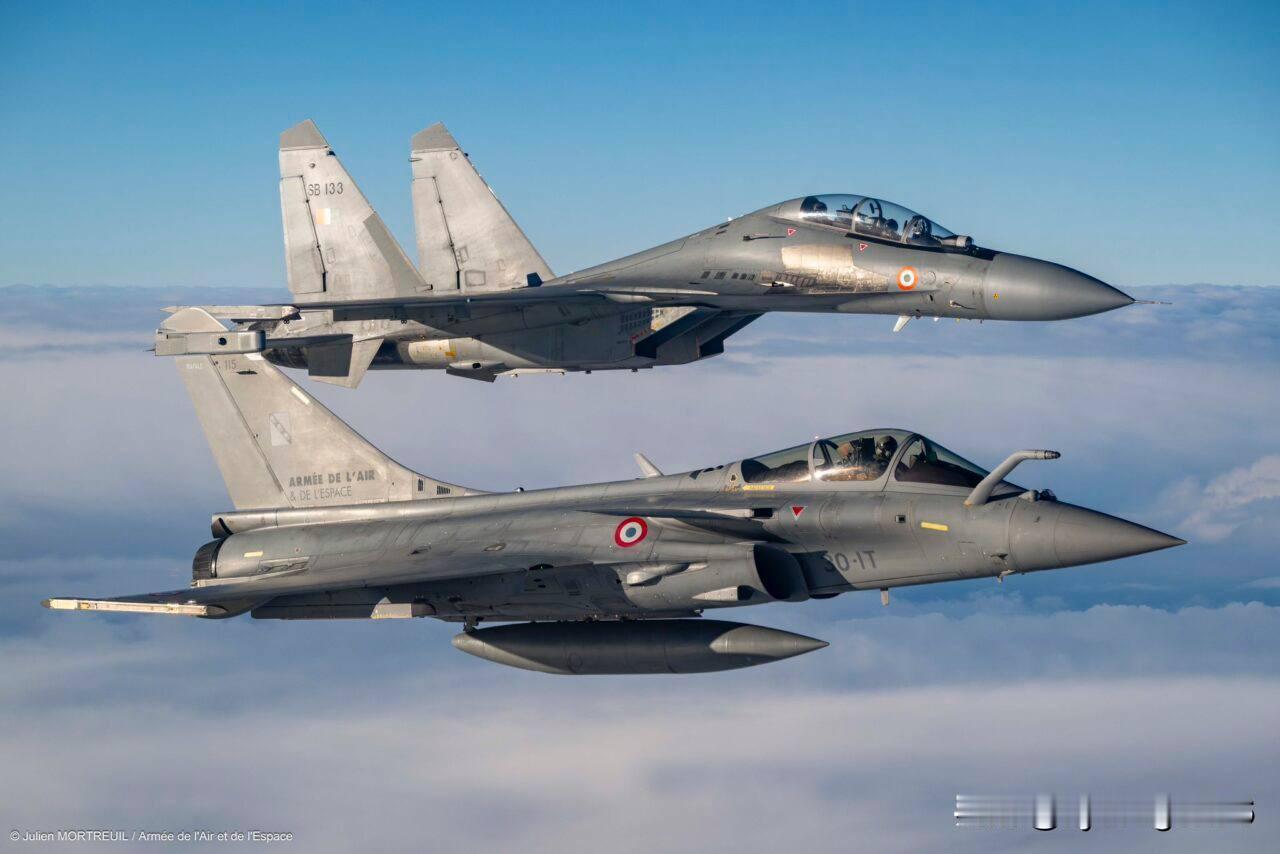 🇮🇳🇫🇷在“加鲁达25”联合演习期间,印度空军的苏-30MKI多用途战斗机和法国空天军的达索“阵风”战斗机并肩作战。