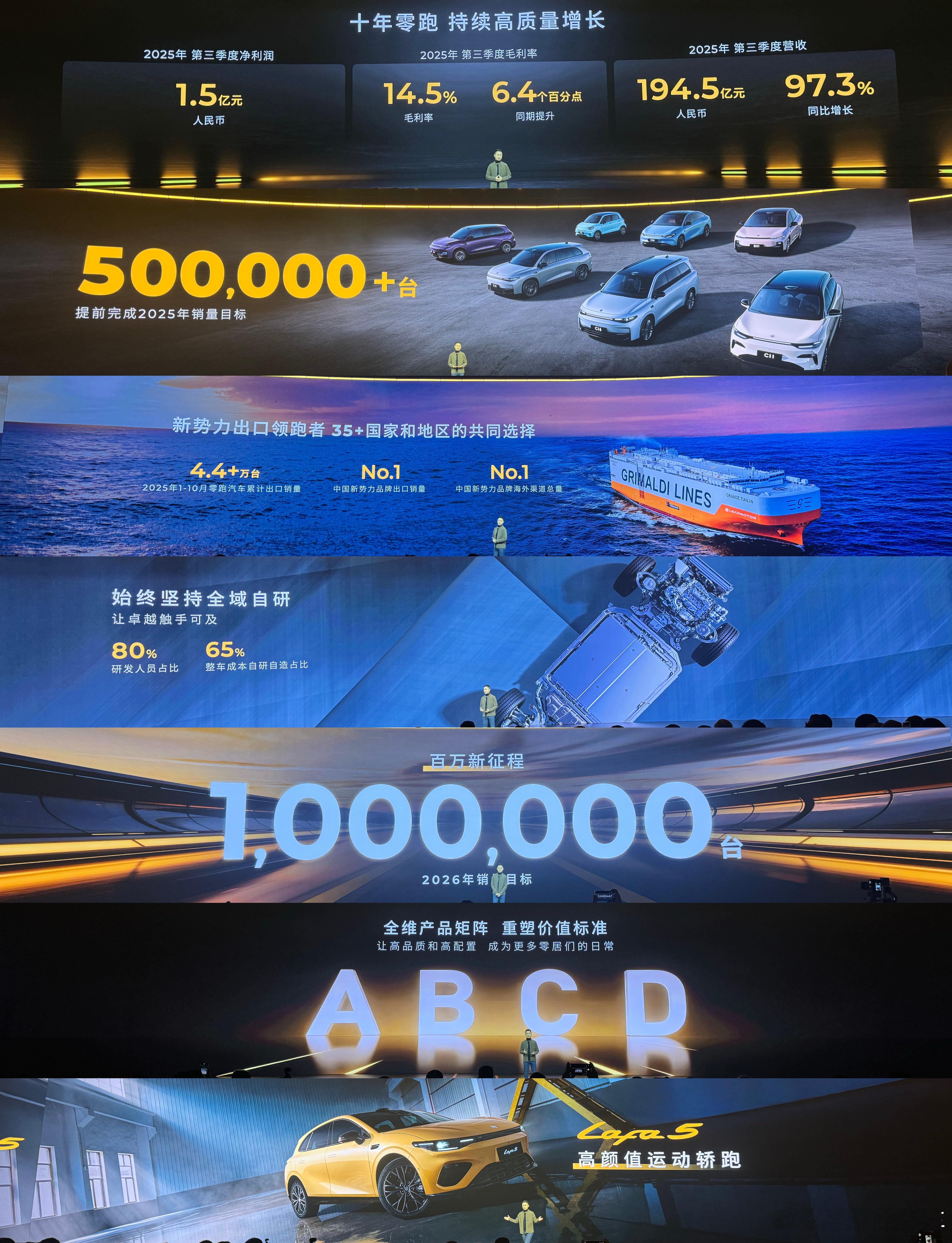零跑Lafa5 发布会开场先汇报了成绩,包括季度盈利、销量达成、出口成绩等,并再次确定零跑 2026 年百万销量目标。新能源汽车零跑