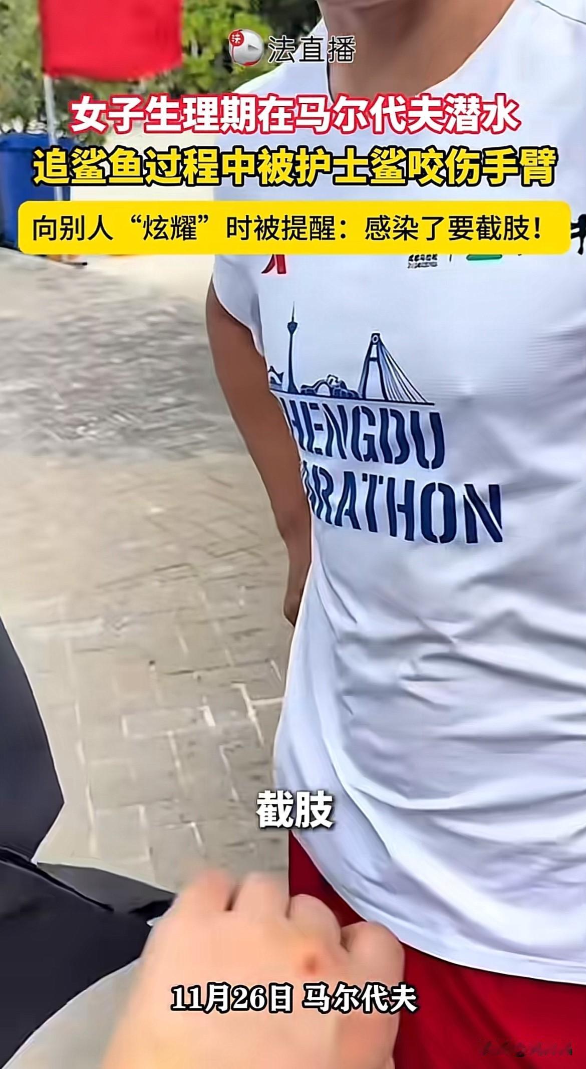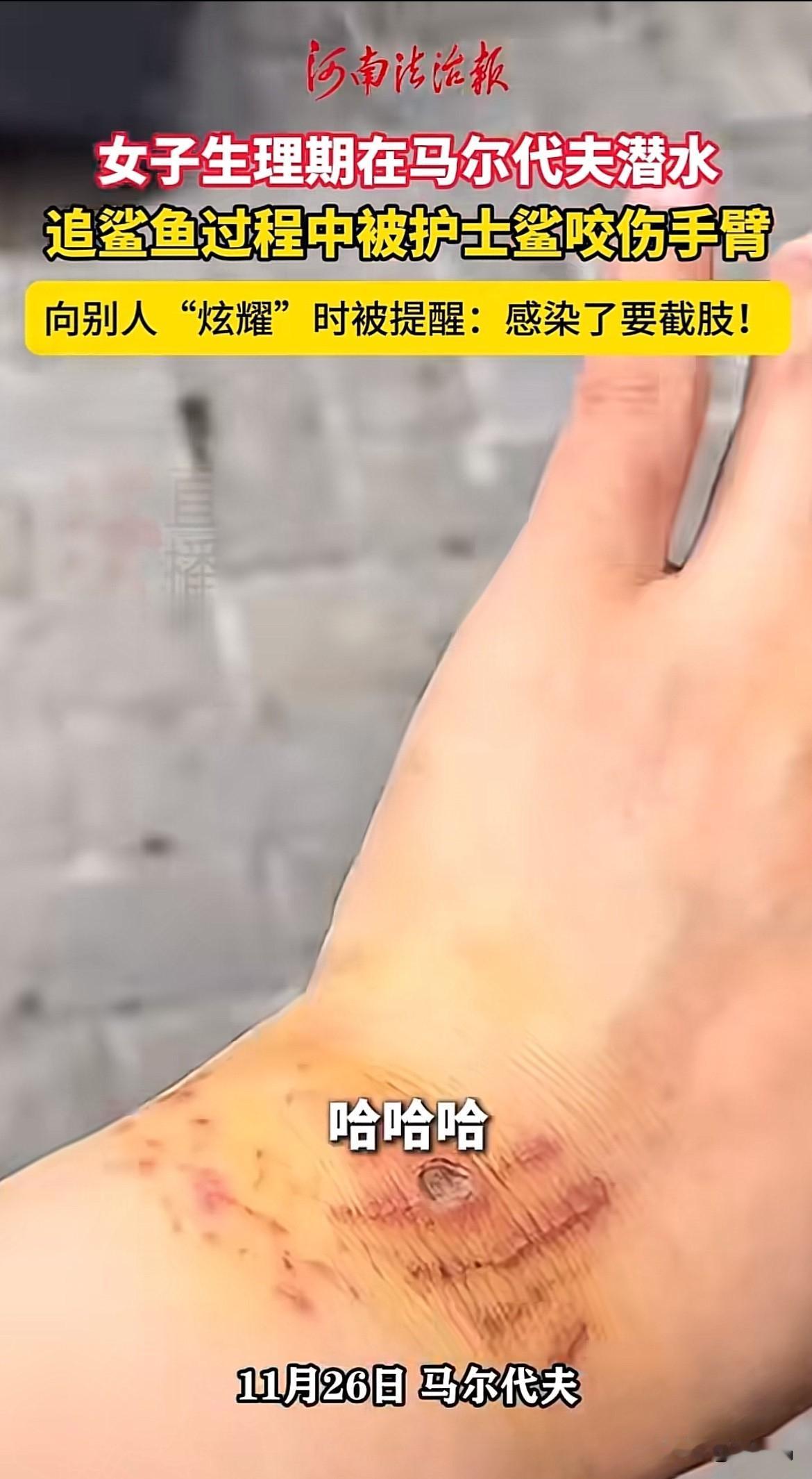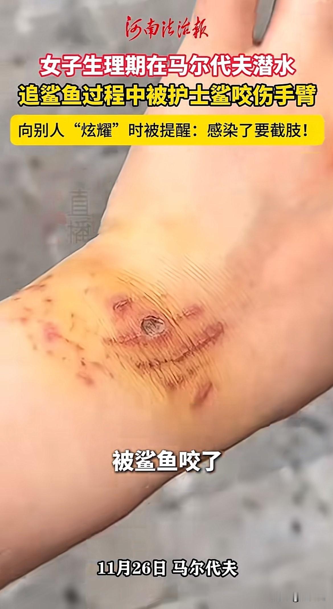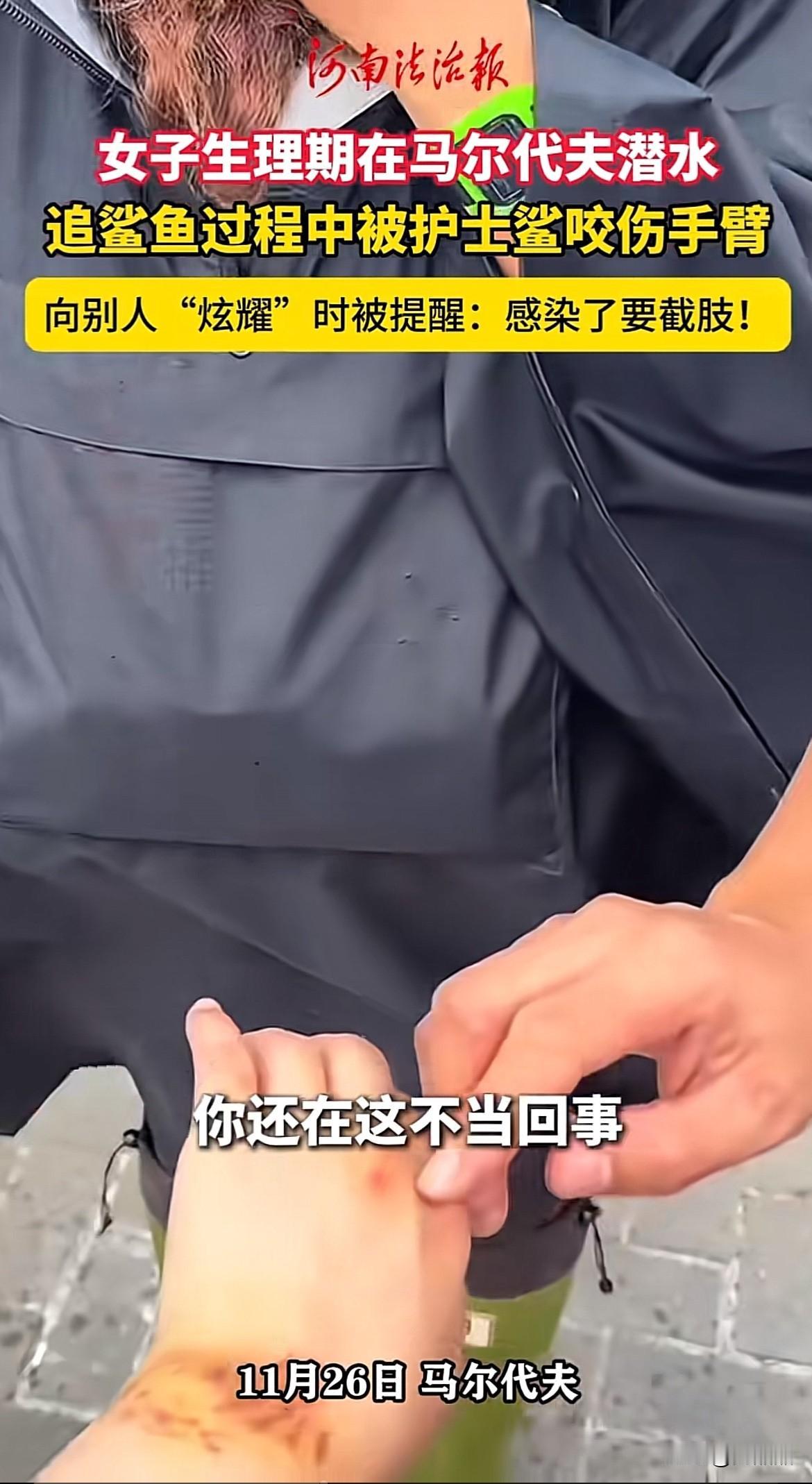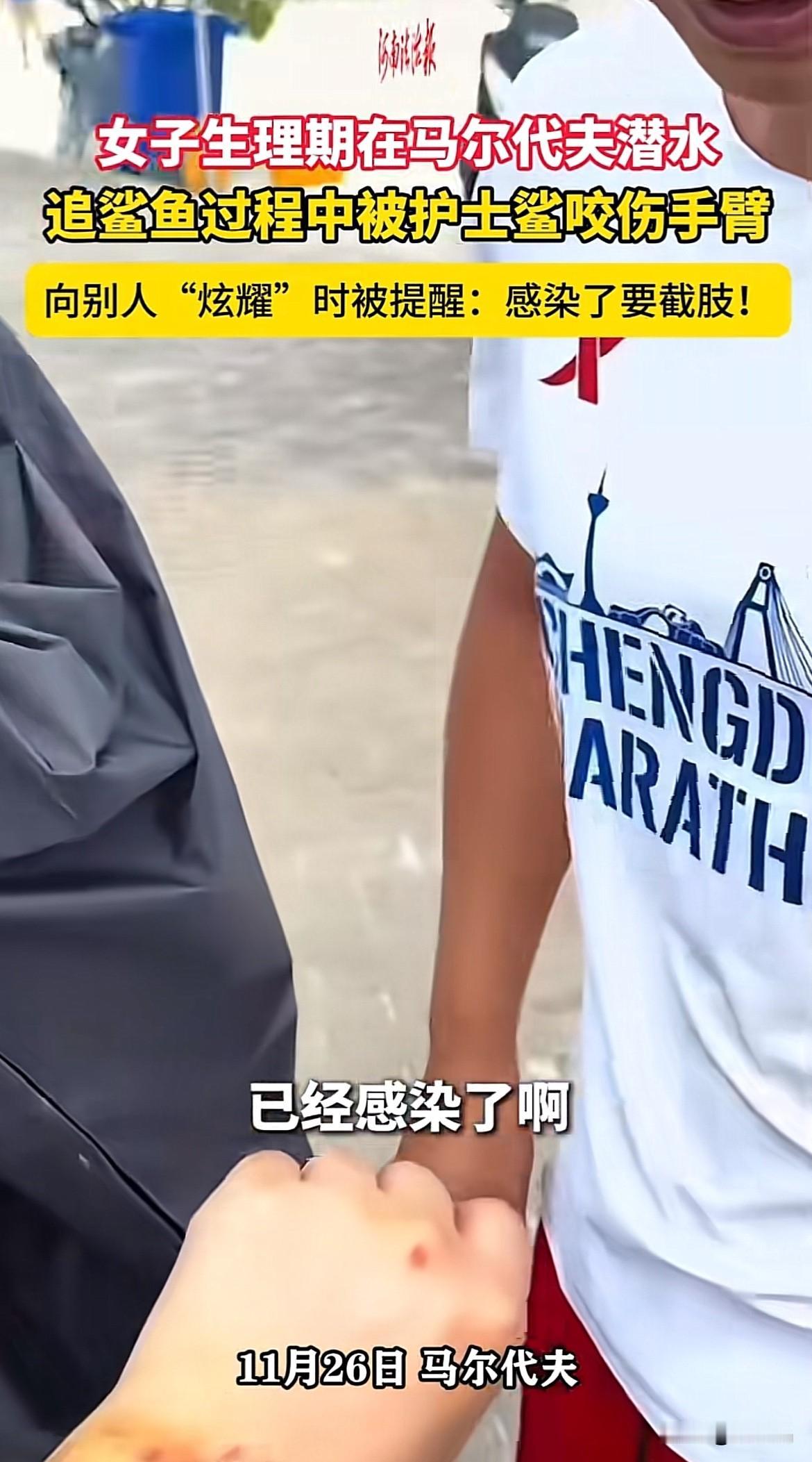 一生追求出片的女人!女子生理期时在马尔代夫潜水被鲨鱼咬伤,朋友提醒严重会截肢,女子仍不当回事。 女子去马尔代夫游玩,当天来了大姨妈,但她还是想体验潜水运动,拍美照作留念。由于摄影师说之前的角度不出片,女子第四次下水,没想到一下水就被围过来的鲨鱼咬伤手臂。 当时教练直接帮她用纱布包起来,没有消毒,没有清水洗,后面才去医院处理伤口。 朋友问怎么弄伤时,女子笑着回应:“潜水时被鲨鱼咬了。” 朋友提醒:“已经感染了啊,你还在这不当回事!” 女子:“哈哈哈,然后呢?” 朋友紧张地说:“截肢啊,会截肢的” 女子:“哈哈哈哈,不会的,我回去就好了”一笑而过,似乎丝毫不在意。 全网都在蹲后续,想知道女子后面伤口是否恢复?会不会截肢。 这女子心真大啊!海洋生物携带细菌比较毒,已经感染还笑嘻嘻的,不当回事。别拿自己的生命开玩笑呀!